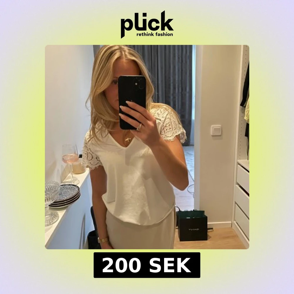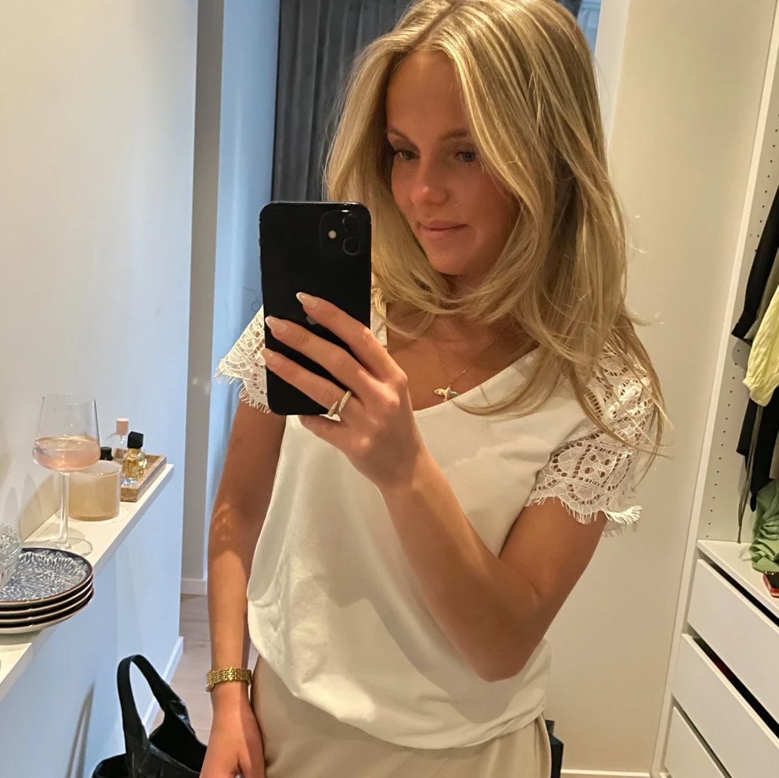 Säljer en söt vit blus med v-ringning och korta ärmar i spets. Enkel och stilren design som passar till mycket.