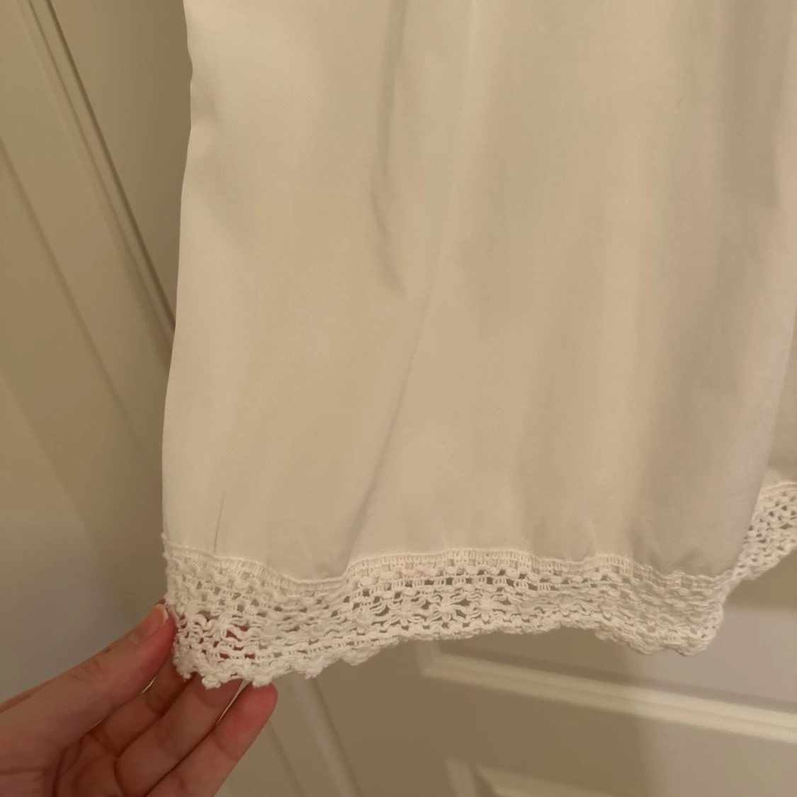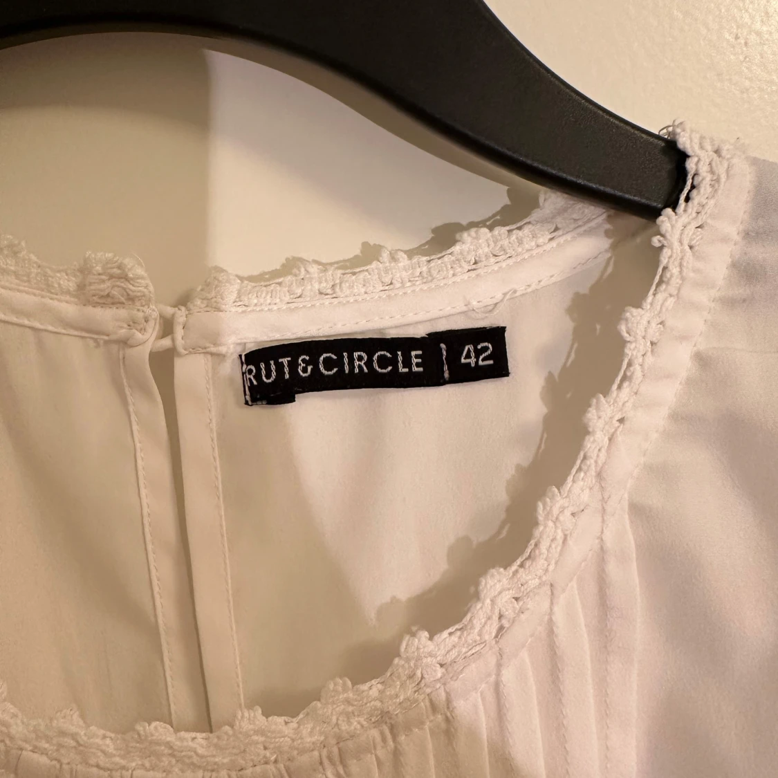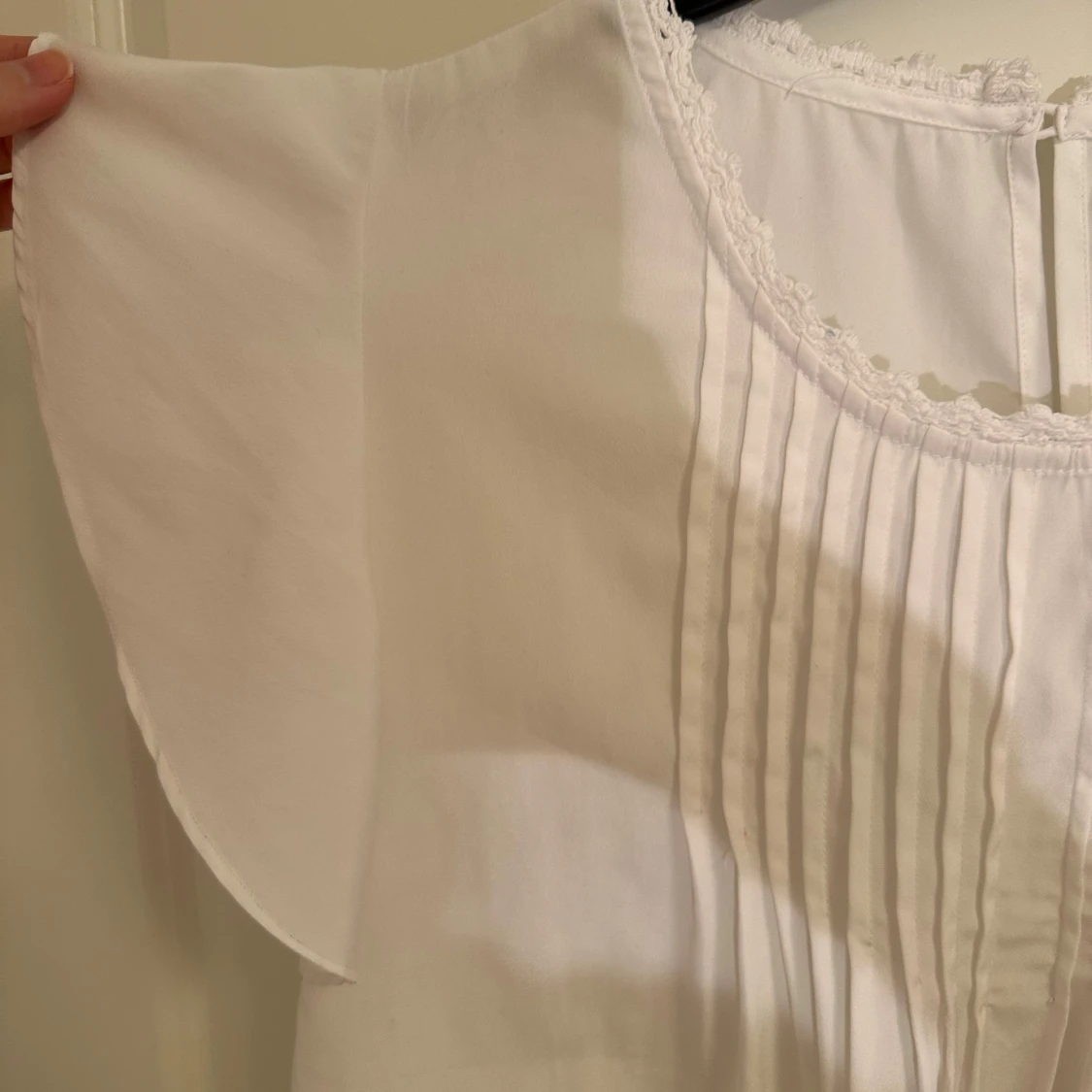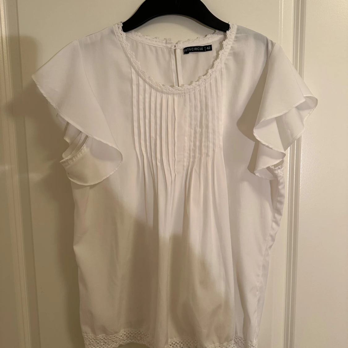 Säljer en söt vit blus med spetsdetaljer vid hals och nederkant. Blusen har korta ärmar med volang och fina veck framtill. Perfekt för en somrig look! Storlek 42 men passar mig med S!💕