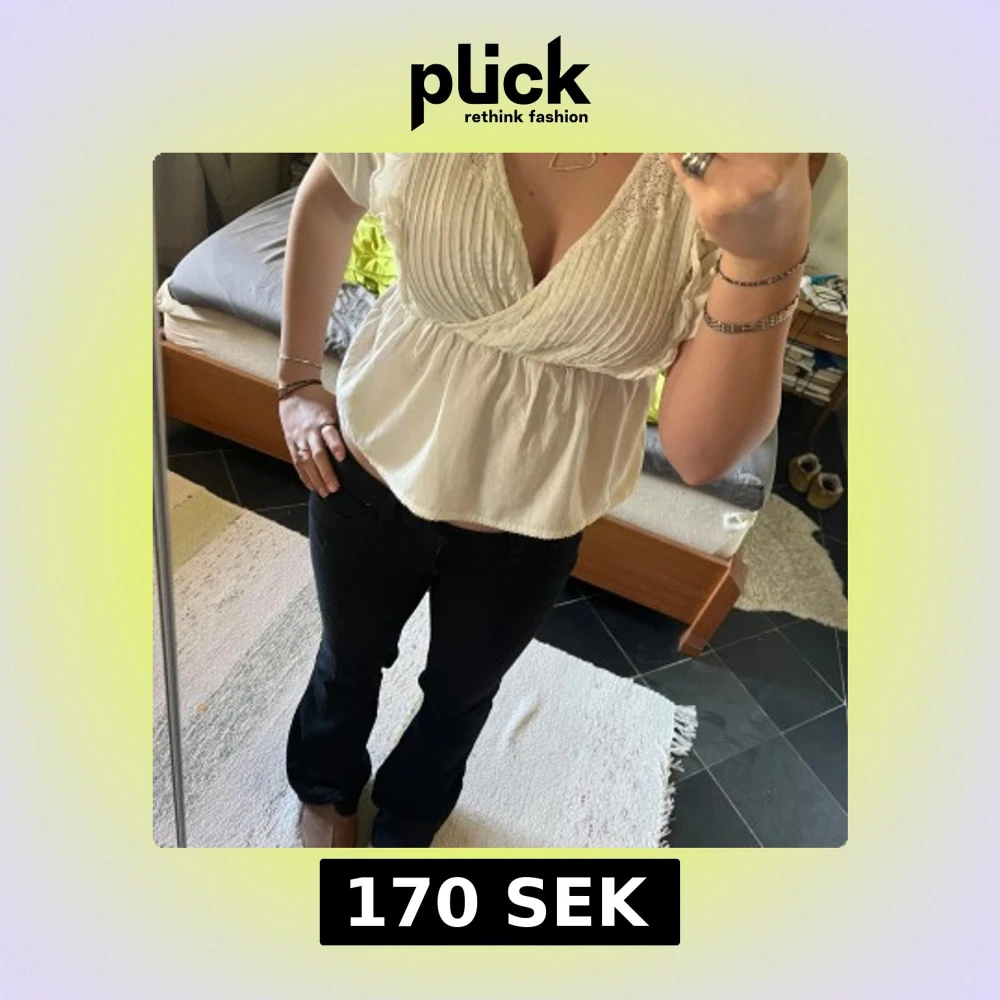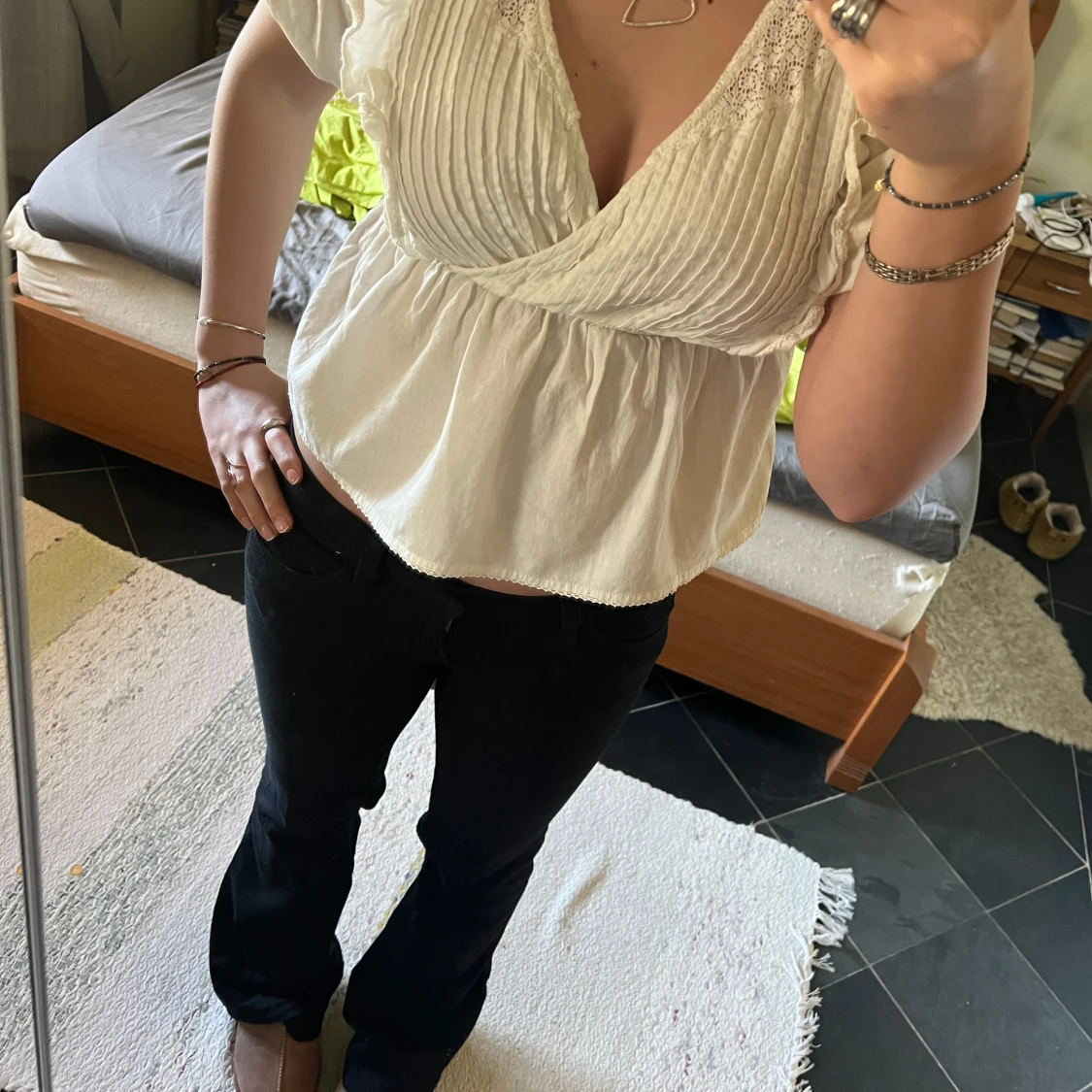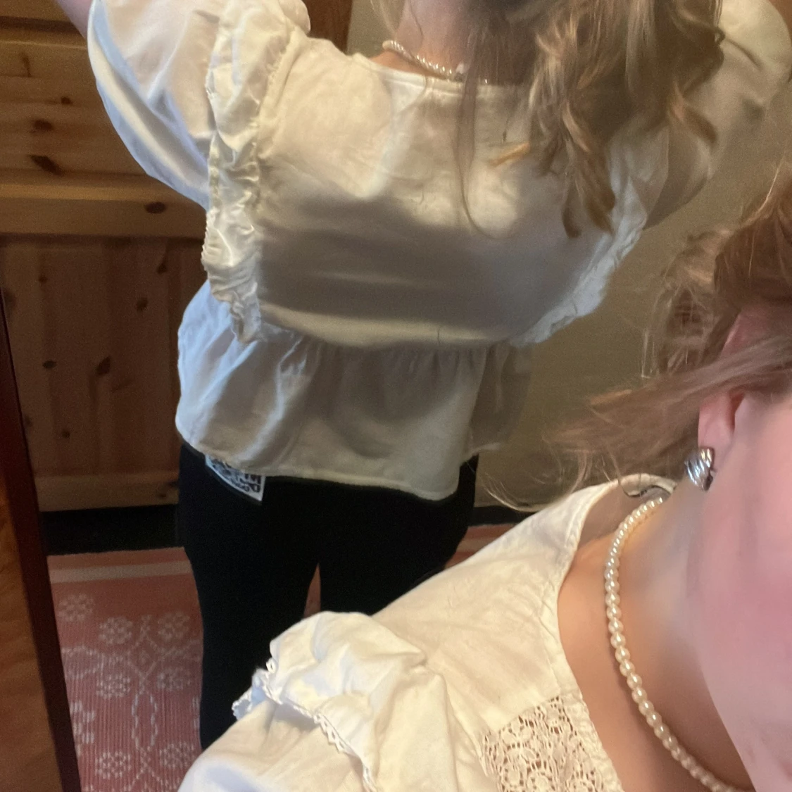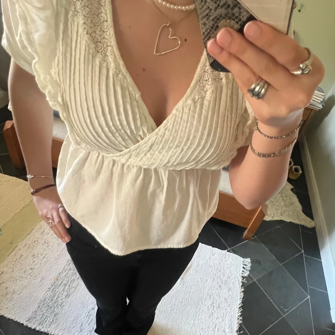 Säljer en söt vit blus med spetsdetaljer, volang och v-ringning. Blusen har korta ärmar och en omlott-design framtill. Perfekt för en avslappnad men stilren look. Använd enstaka gång 💓