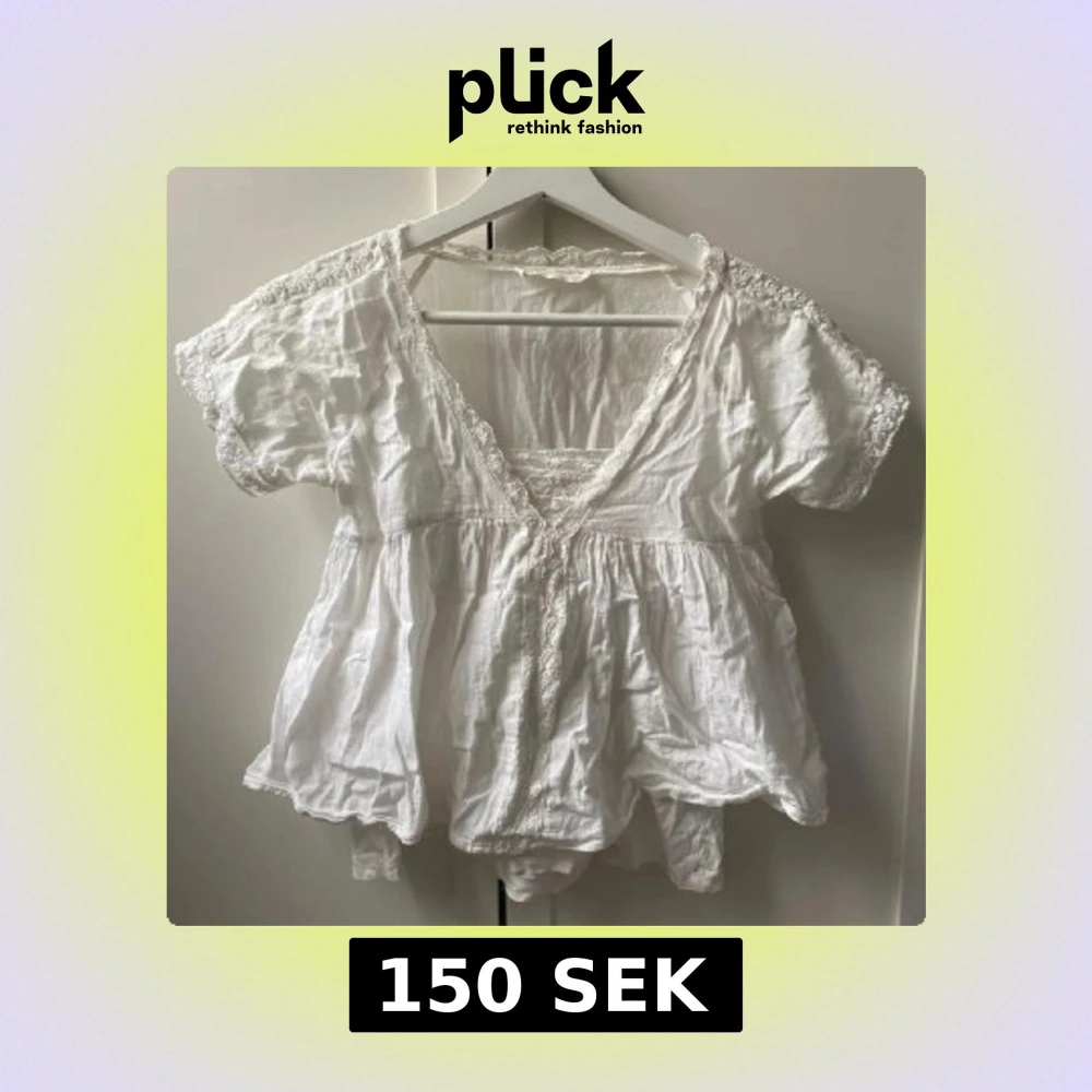 Söt vit blus med v-ringning och spetsdetaljer längs kanterna. Blusen har korta ärmar och en luftig, flowy passform som ger en romantisk vibe. Perfekt för varma dagar och enkel att styla med jeans eller kjol.