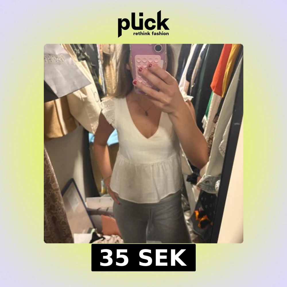 Säljer en söt vit blus med v-ringning och spets på axlarna. Blusen har en lätt volang nertill och är ärmlös, perfekt för varmare dagar. Passar till både jeans och kjol. sSkriv för fler bilder och info🥰