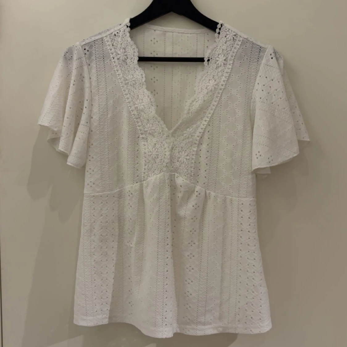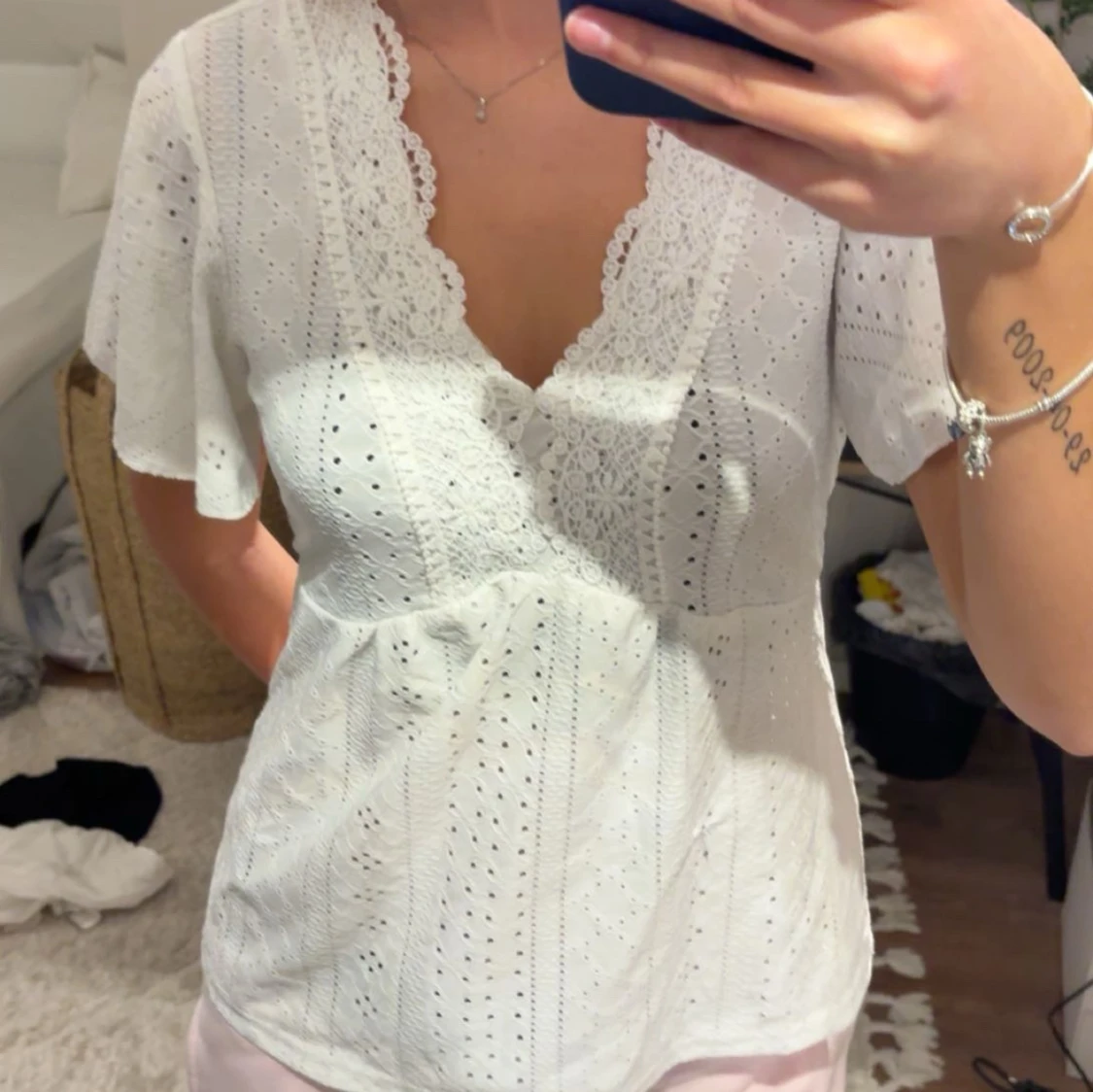 Säljer en söt vit blus med v-ringning och spetsdetaljer. Blusen har korta ärmar och ett fint hålmönster som ger en romantisk känsla. Perfekt för varmare dagar eller sommarens festligheter.