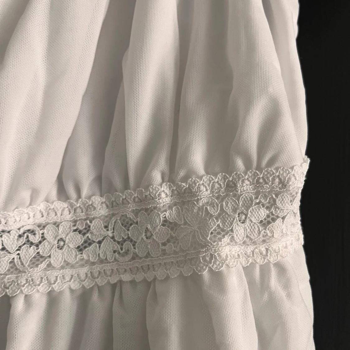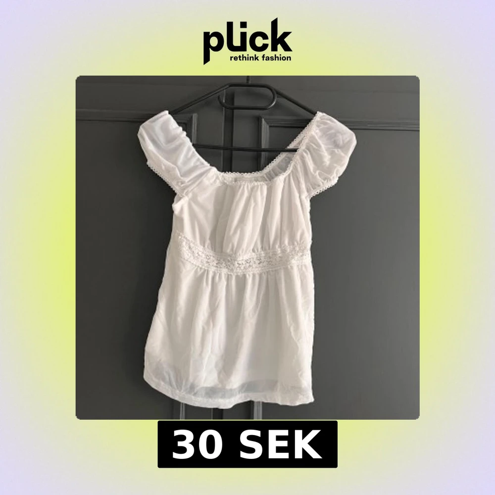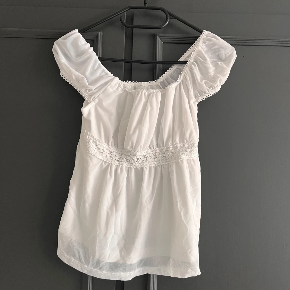 Söt vit blus med puffiga korta ärmar och vackra spetsdetaljer vid midjan och ärmslut. Är från shein därav priset