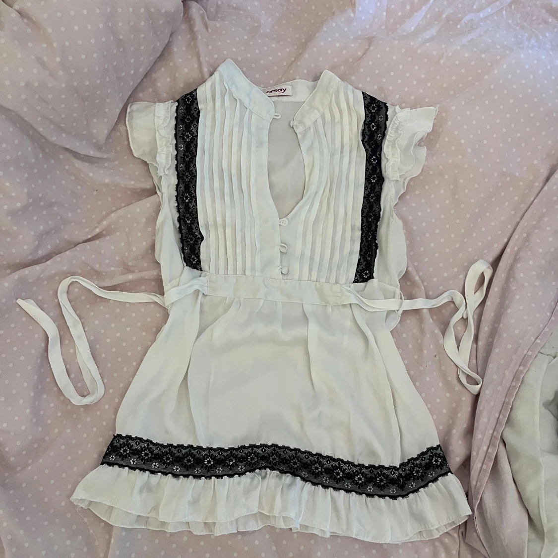 Supersöt vit blus med svarta spetsdetaljer längs sidorna och nertill. Blusen har knappar framtill, volangärmar och knytband i midjan. Plisserad upptill och lätt v-ringad för en feminin look.