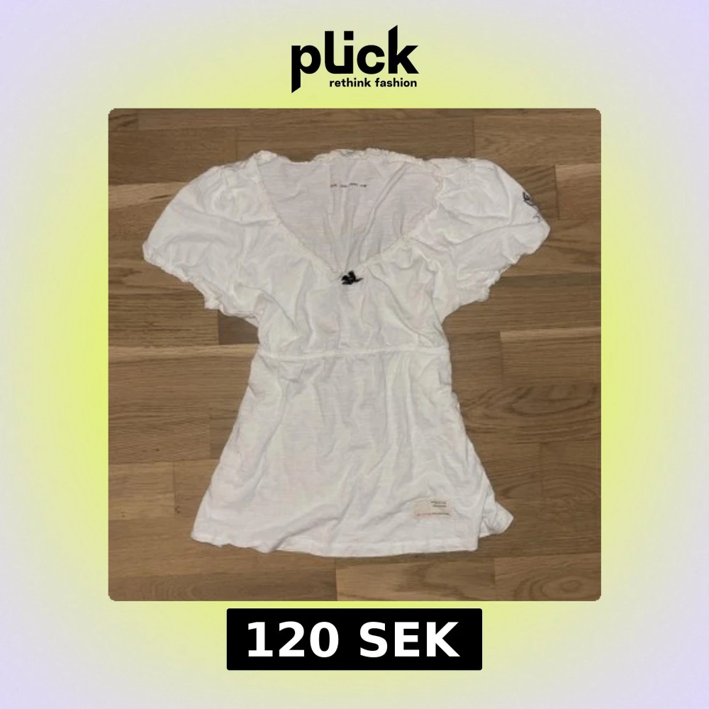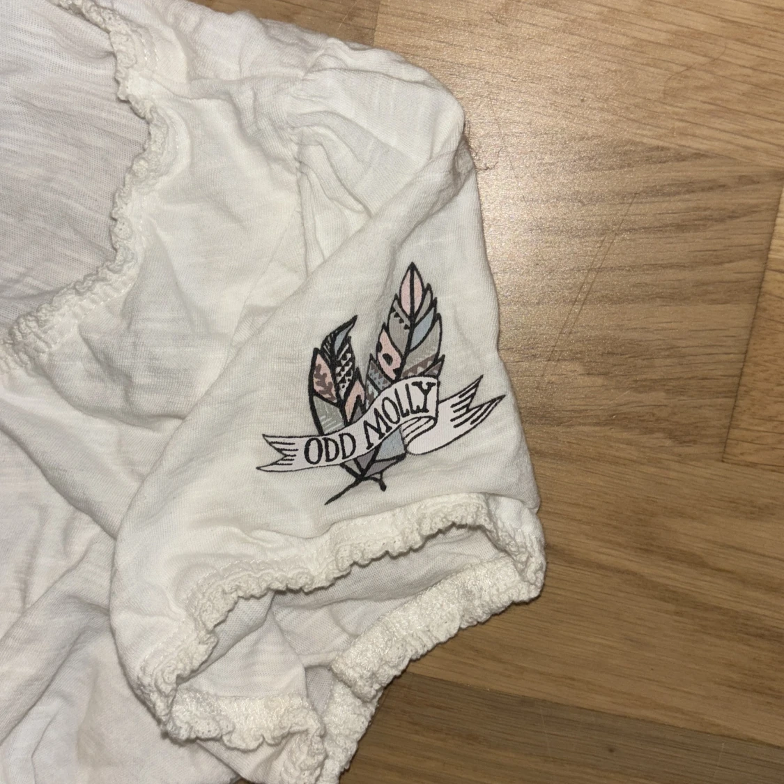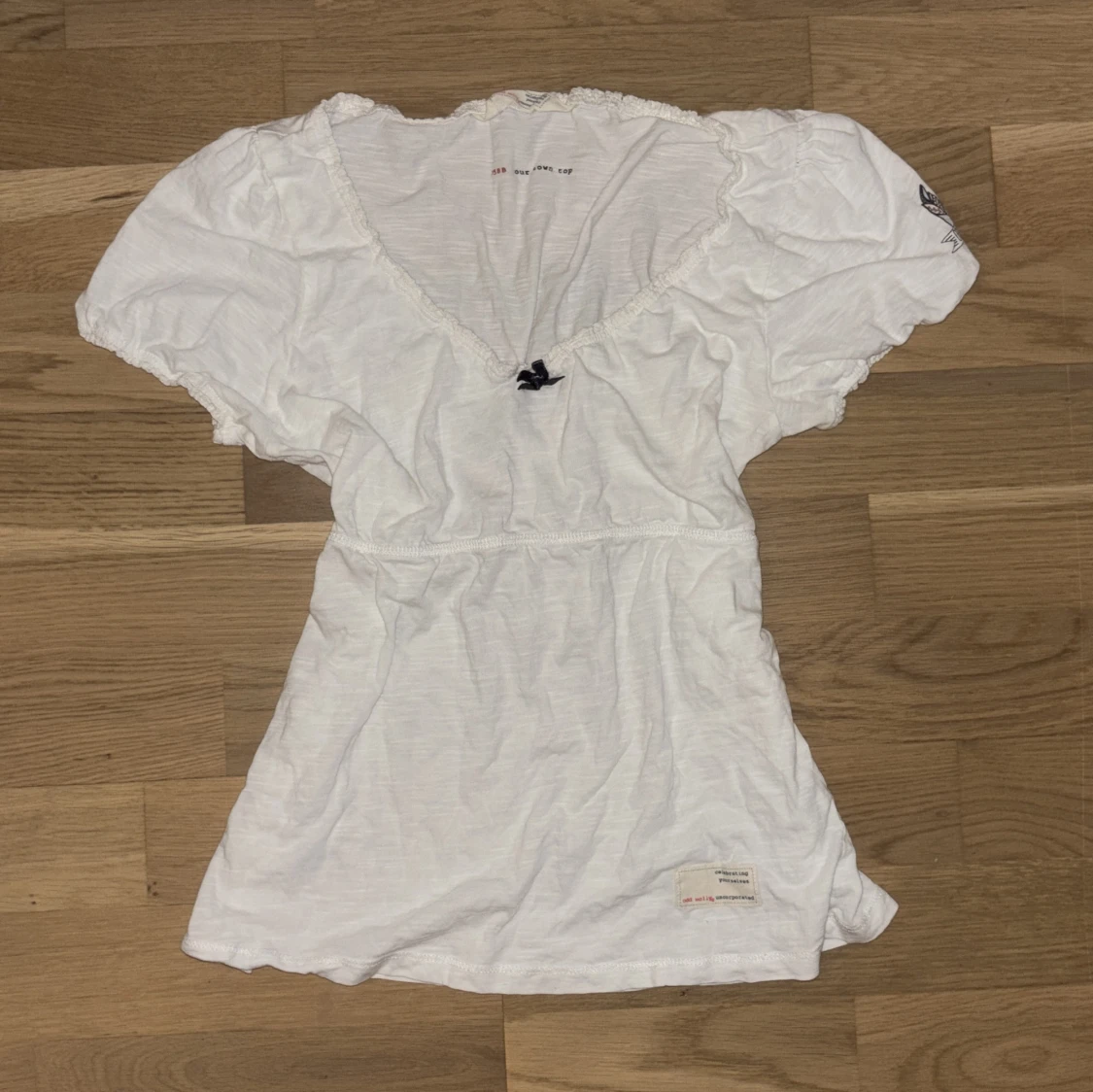 Supersöt vit blus från Odd Molly med v-ringning, kort puffärm och liten rosett framtill. Blusen har broderad logga på ena ärmen och volangkant vid hals och ärmslut. Perfekt för en fräsch och avslappnad look.
