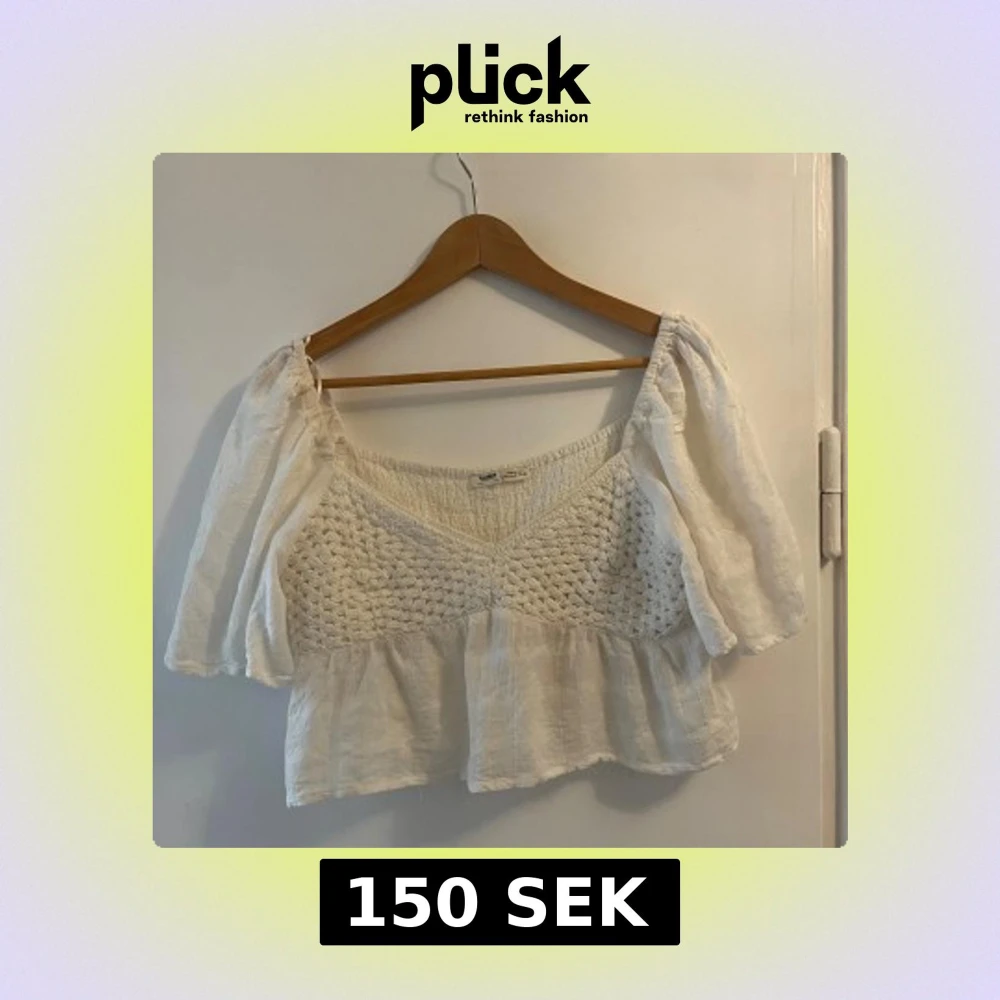Superfin vit blus från Pull&Bear med virkade detaljer över bysten och flowiga, vida ärmar. Toppen har v-ringning och är croppad med lätt volang nedtill. Ärmen och volangen nedtill är lätt genomskinliga (se bild med min hand under). Det är en jätteliten lätt slitning under bröstet men inget man ser eller lägger märke till!
