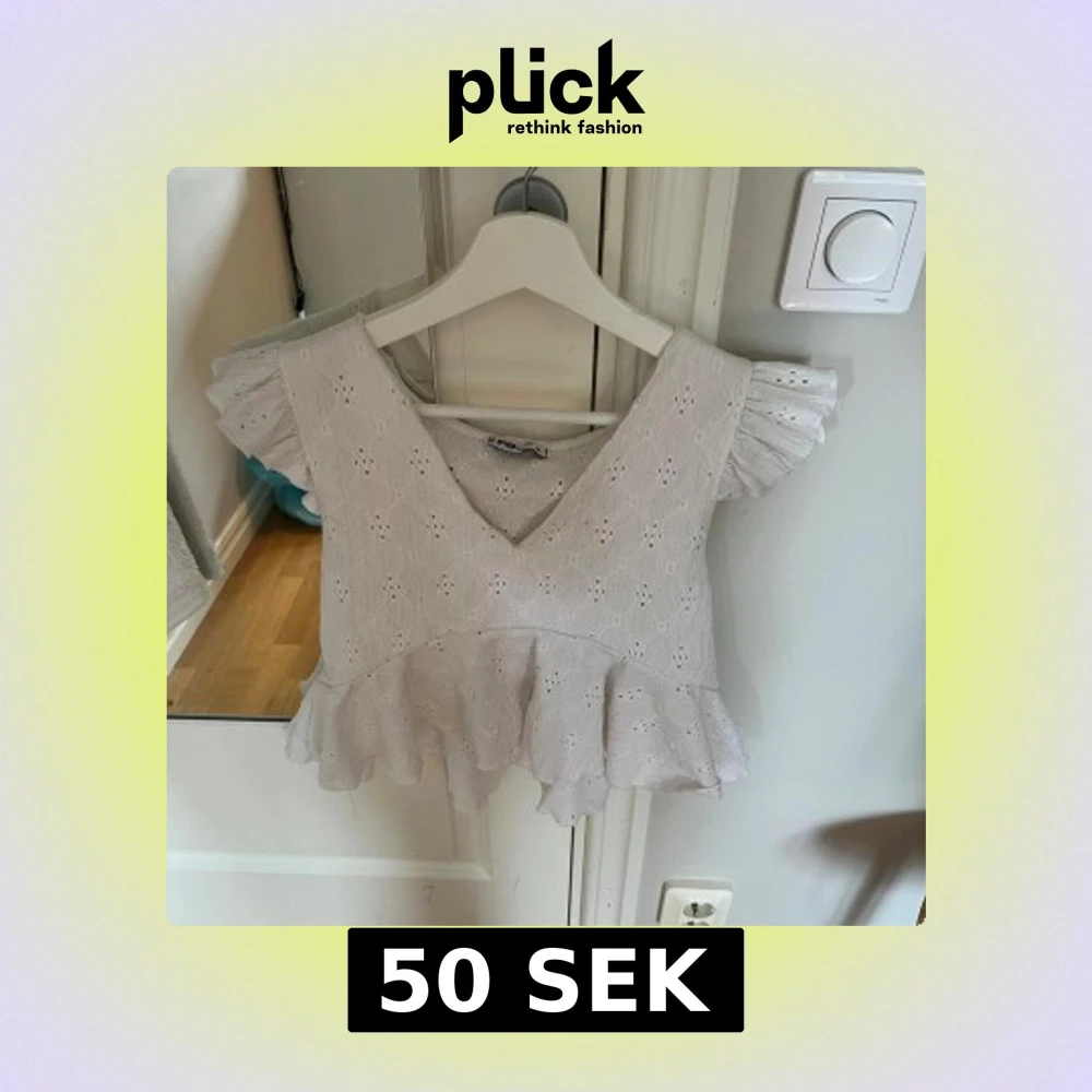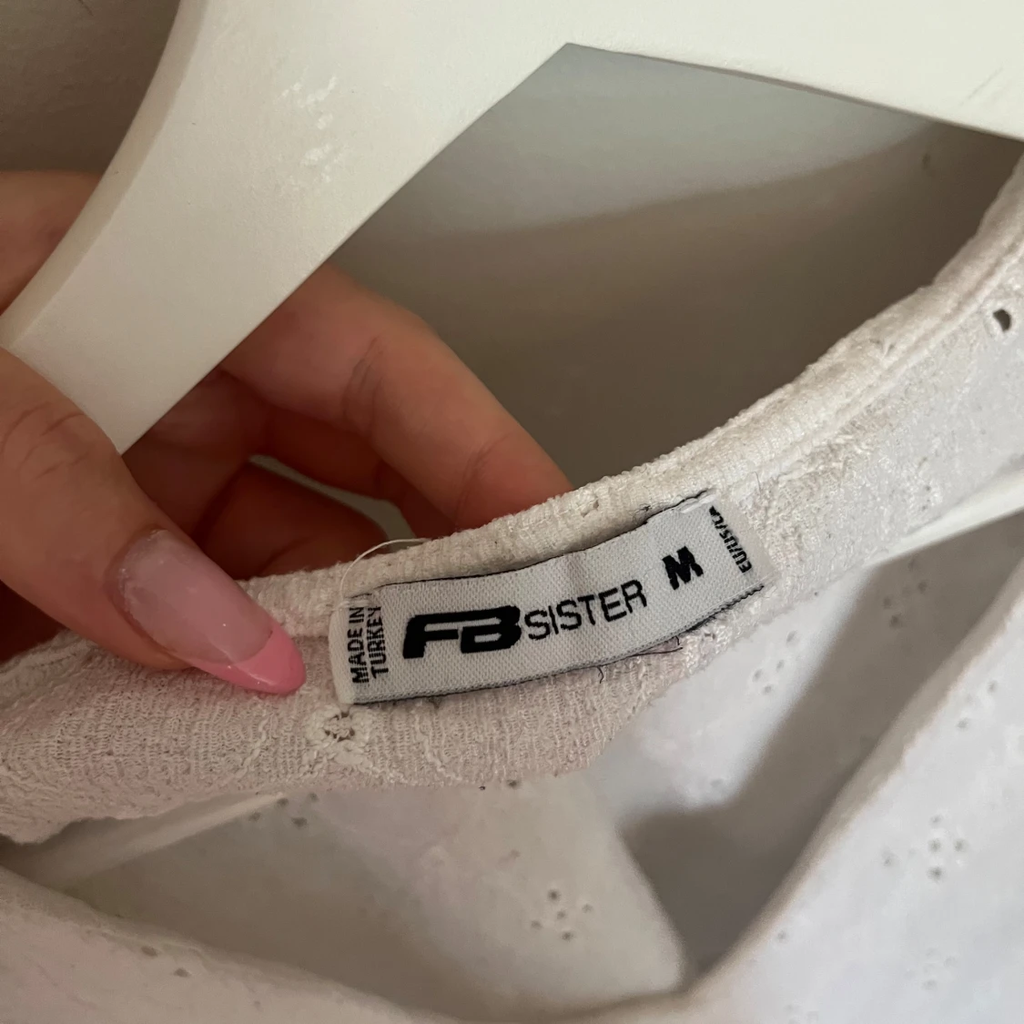 Supersöt vit blus från FB Sister med broderade hål och volang nertill. Toppen har v-ringning, korta volangärmar och är gjord i bomull. Kommer tyvärr inte längre till användning. Även fast den är i storlek M så passar den mig perfekt som vanligtvis har storlek Xs/S.