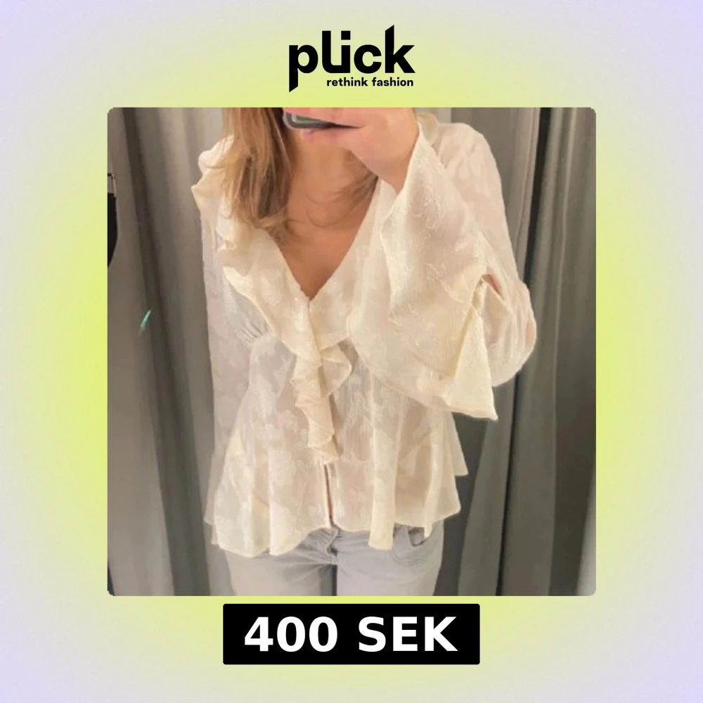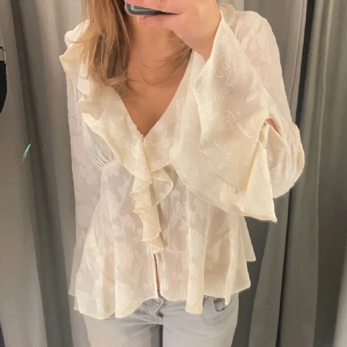 Säljer en söt vit blus med v-ringning och volangdetaljer framtill. Priset kan diskuteras vid snabb affär😊