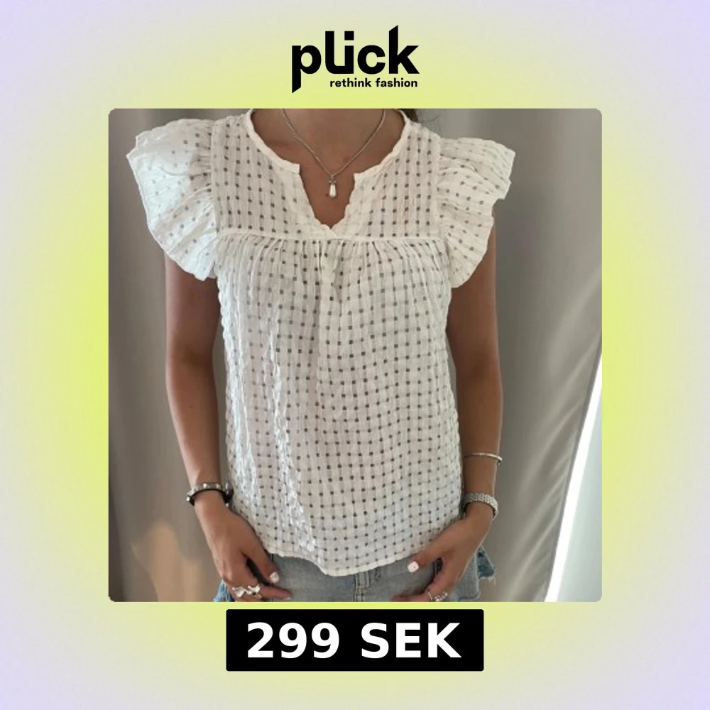 Supersöt vit blus med rutigt strukturmönster och volangiga korta ärmar. Vet ej märke
