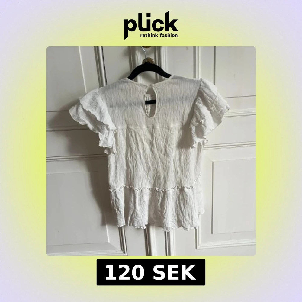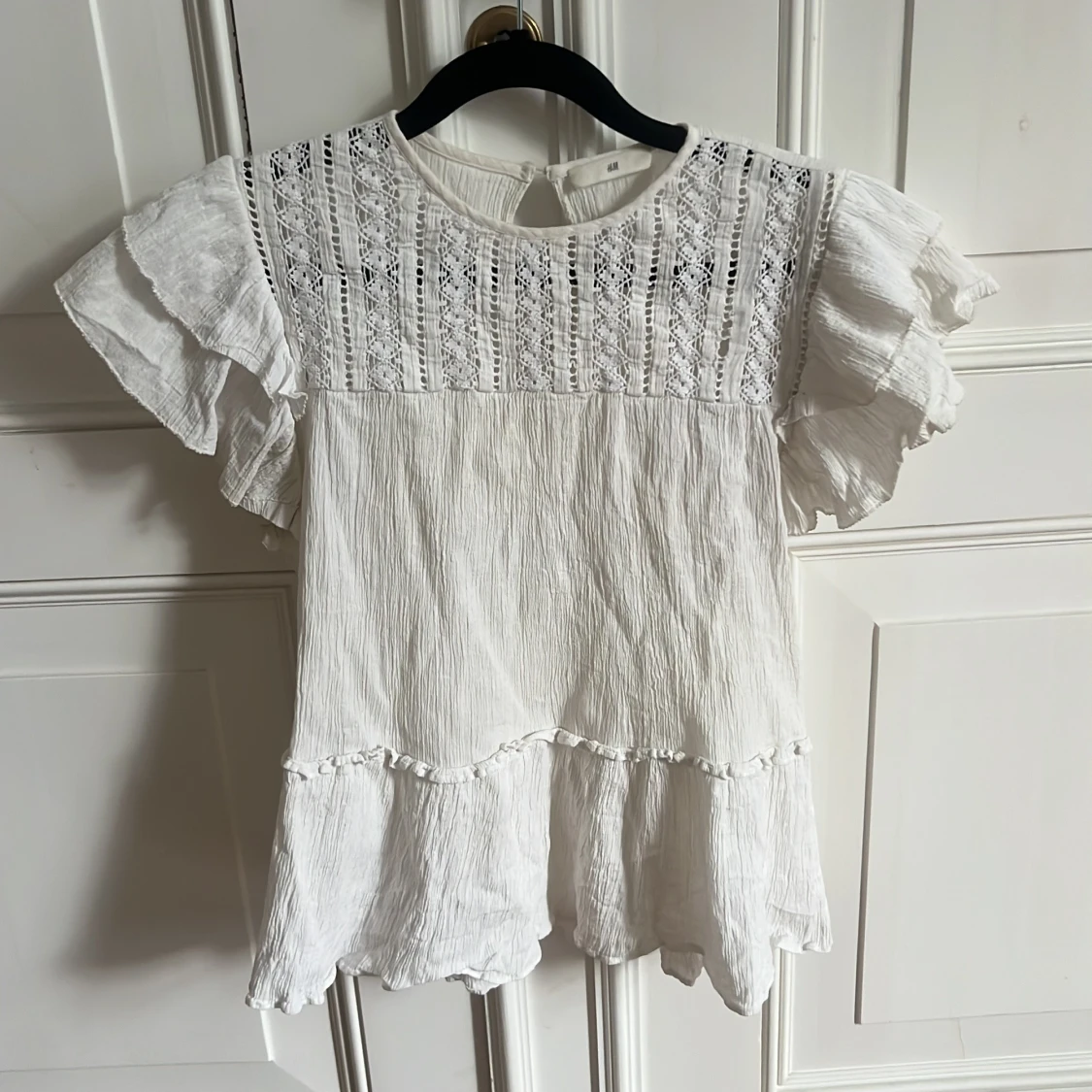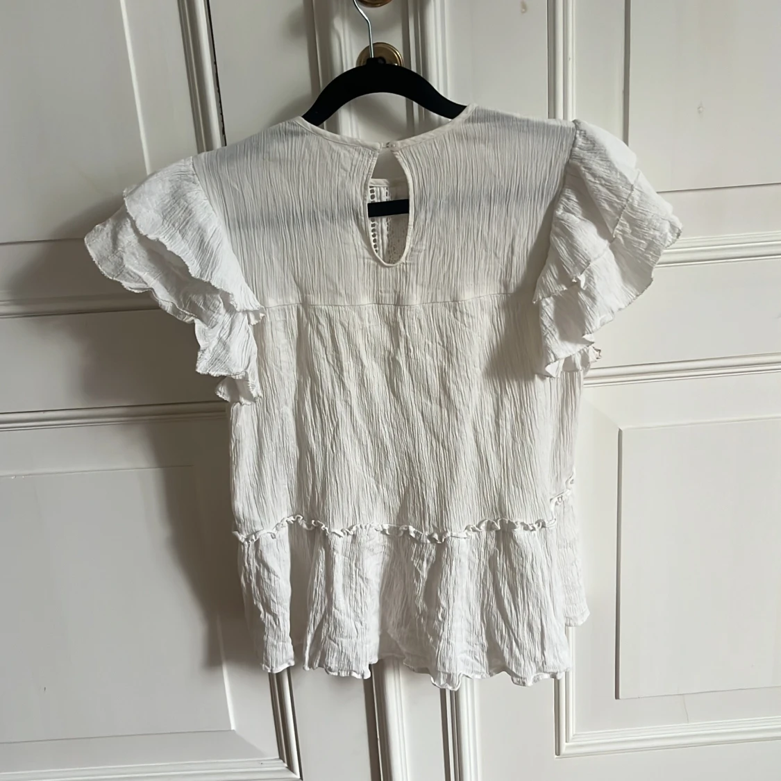 Säljer en söt vit blus med volangärmar och spets upptill. Blusen har en lös passform och dekorativa detaljer. Perfekt för vår och sommar! Sparsamt använd