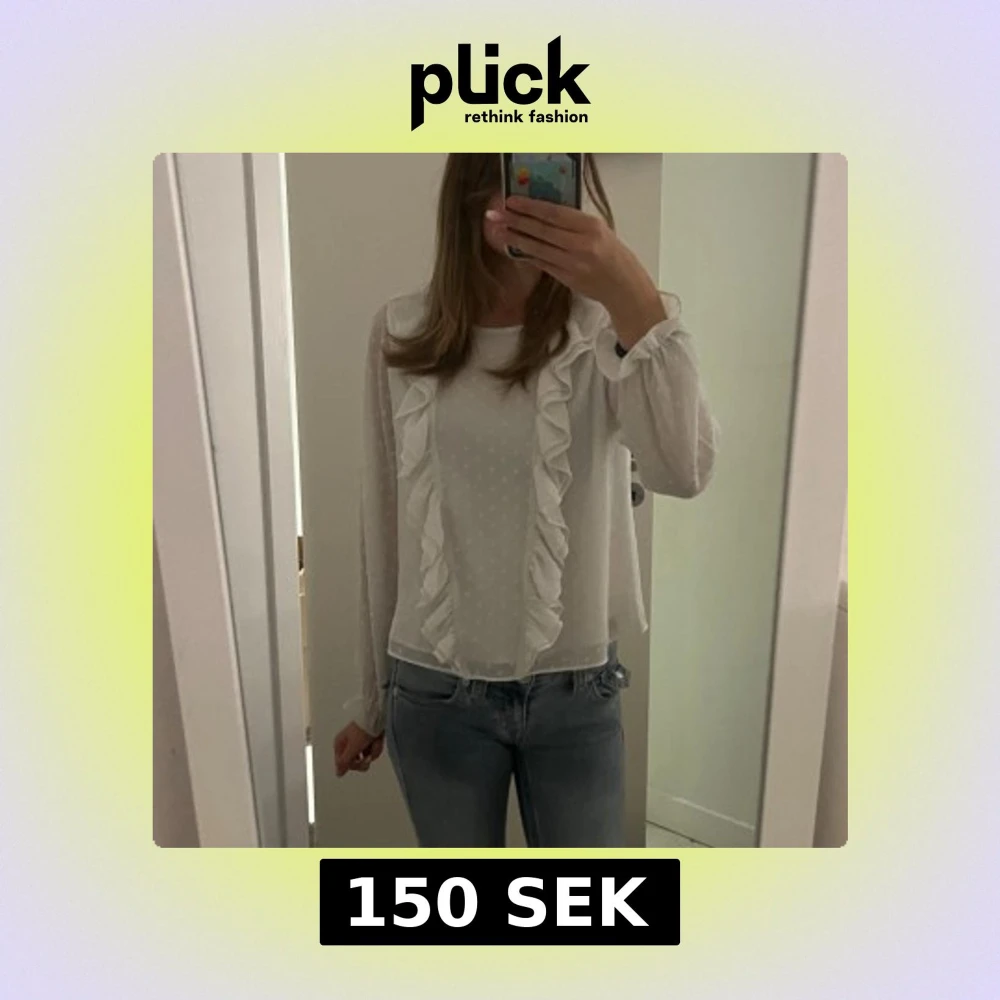 Supersöt vit blus med diskreta prickar och stora volanger framtill. Långärmad modell med lätt transparent tyg och rund halsringning.