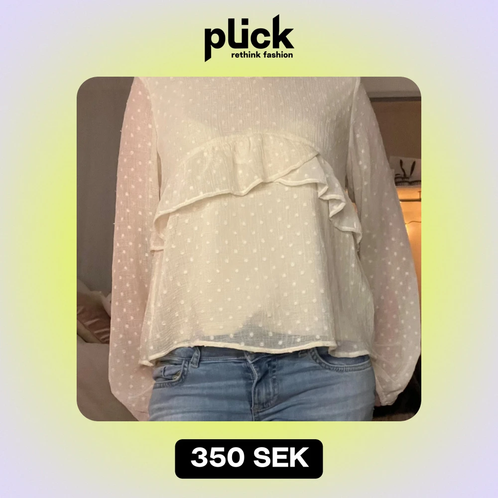 Säljer en söt vit blus med prickigt mönster och volangdetaljer framtill. Blusen har långa ärmar och en luftig passform, perfekt för vår och sommar. Den är gjord i ett lätt och bekvämt material, vilket gör den idealisk för både vardag och festliga tillfällen. Använd endast ett fåtal gånger