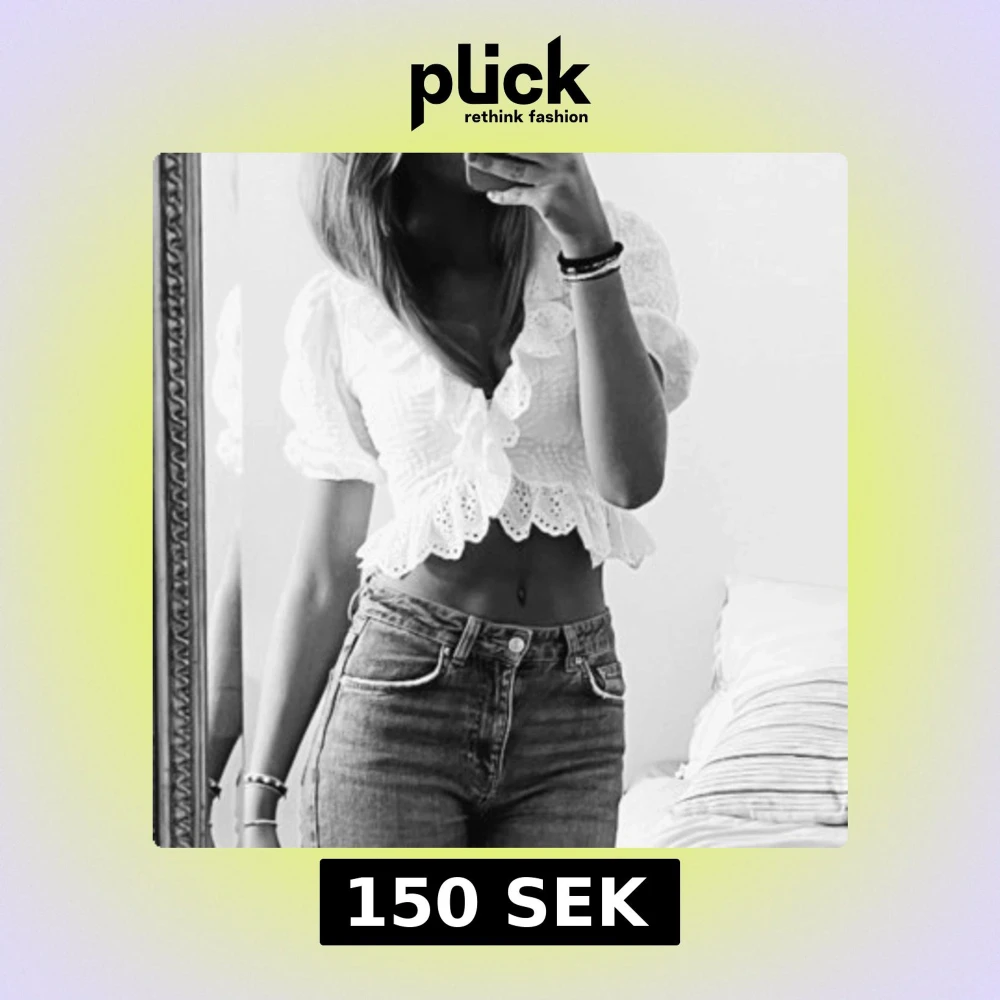 Säljer en söt vit blus med volangdetaljer och spets. Blusen har en v-ringad design och korta ärmar. Perfekt för en somrig look. Passar bra till både jeans och kjol.