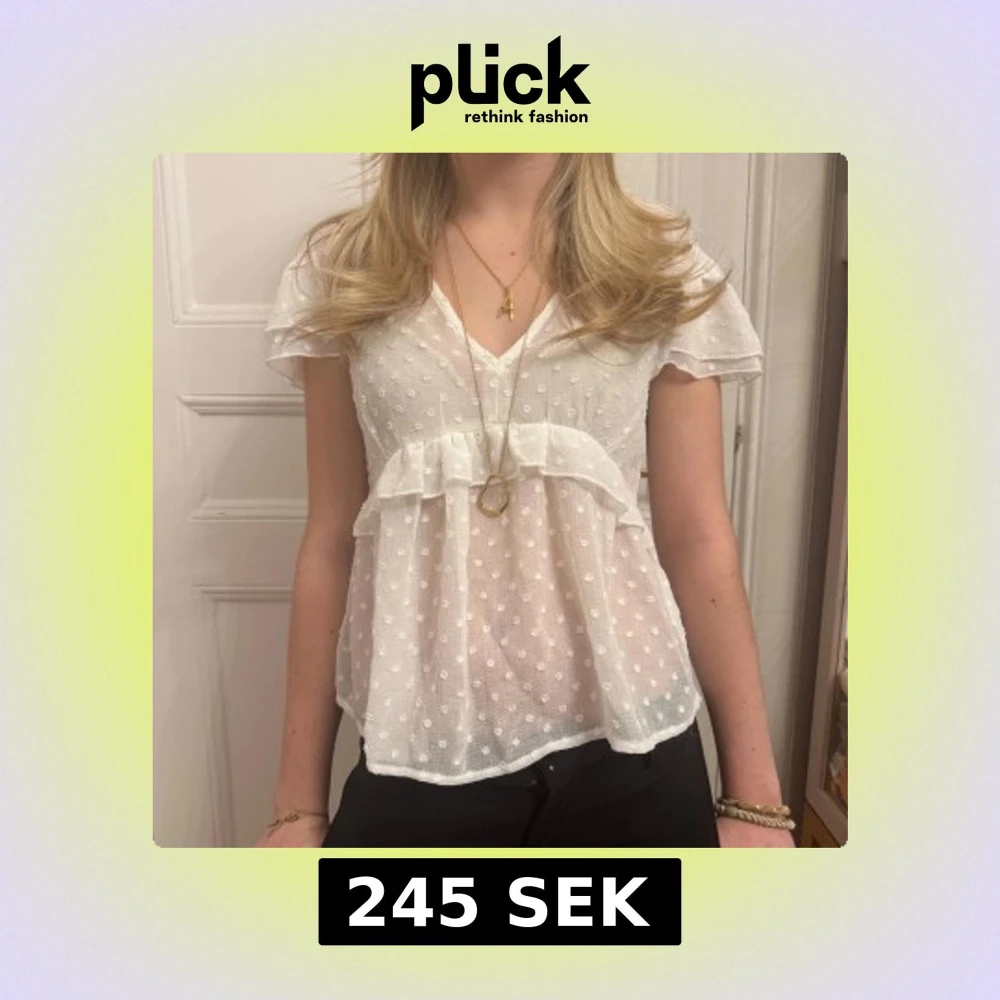 Vit blus med korta ärmar och volangdetaljer. Använd max en gång.
