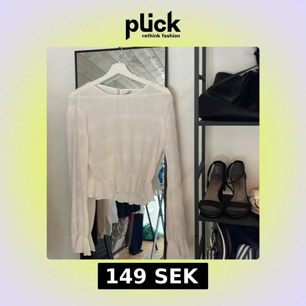 Supersöt vit blus från H&M med volangkant både vid ärmslut och nederkant. Blusen har långärmade, lätt transparenta ärmar och ett plisserat tyg som ger en cool struktur. Perfekt för dig som gillar romantiska vibes och vill ha något extra till outfiten.