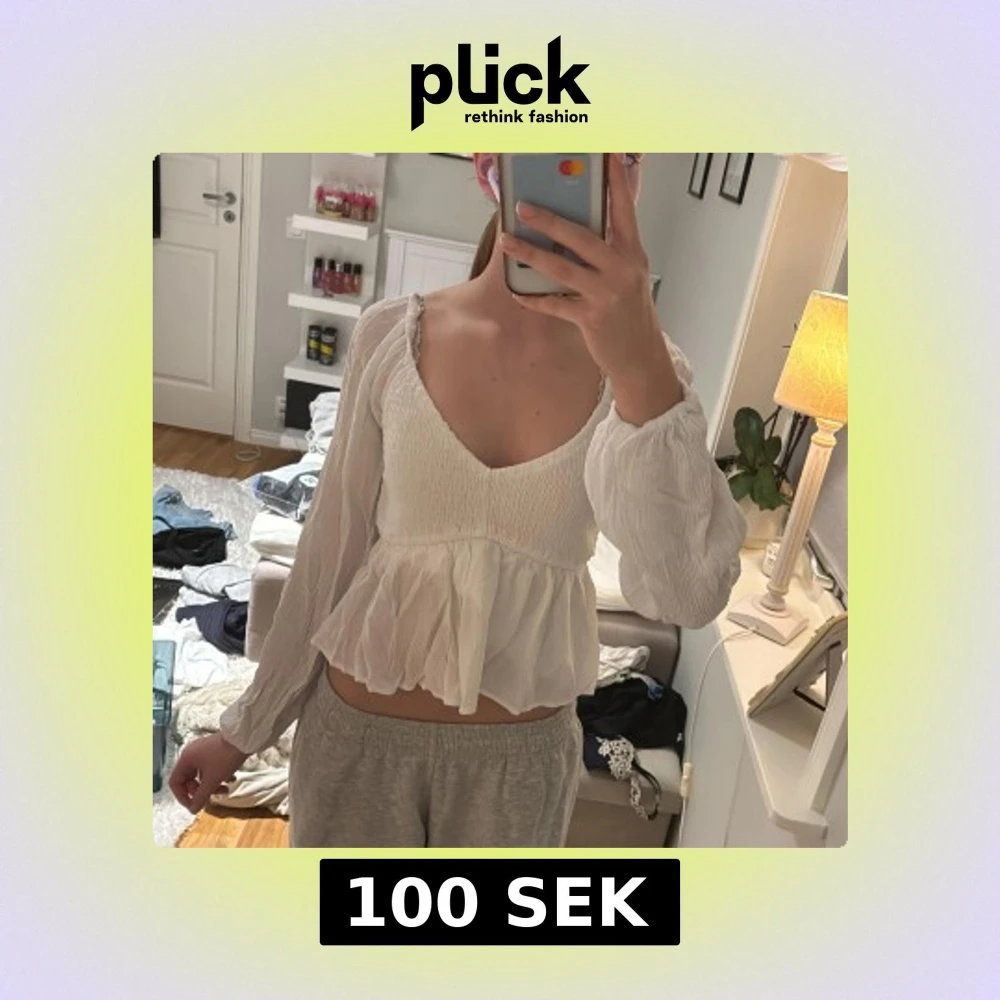Säljer en söt vit blus med volangdetaljer och långa ärmar. Blusen har en v-ringad design och är perfekt för en romantisk look. Den är både stilren och bekväm, idealisk för olika tillfällen.
