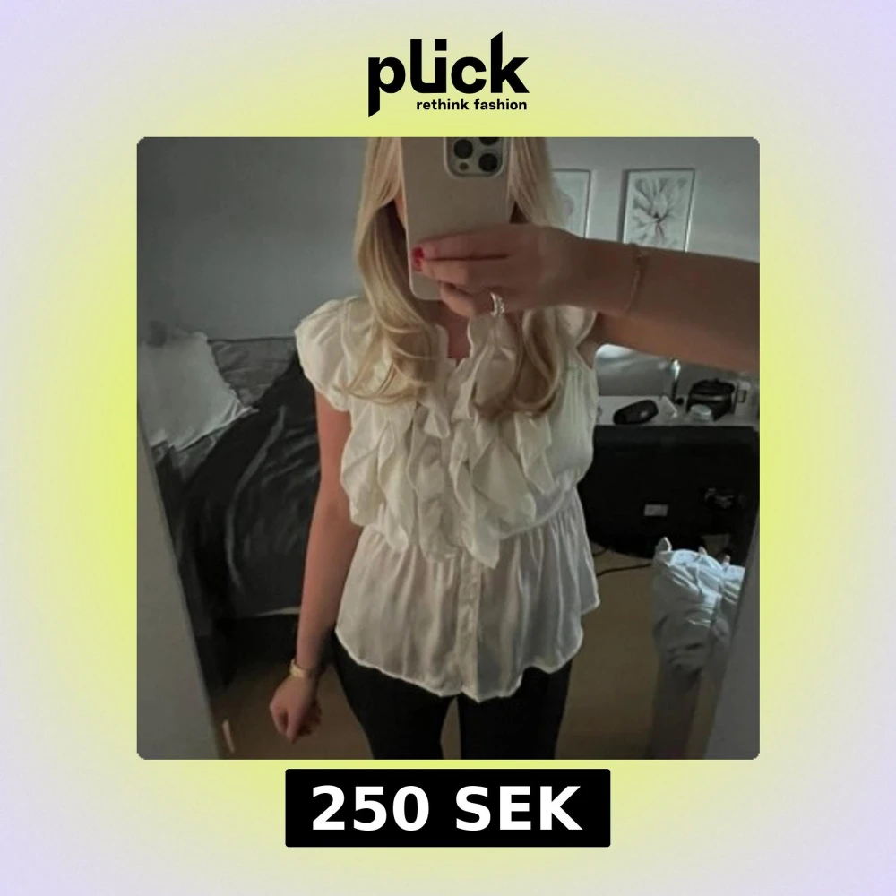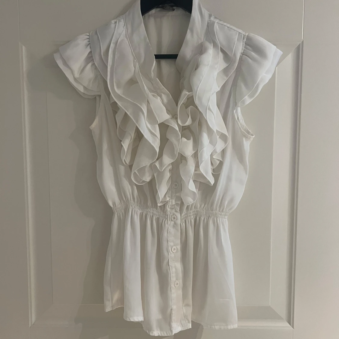 Supersöt vit blus med volanger framtill och knäppning hela vägen ner. Blusen är ärmlös och har en lätt markerad midja med resår 🩷