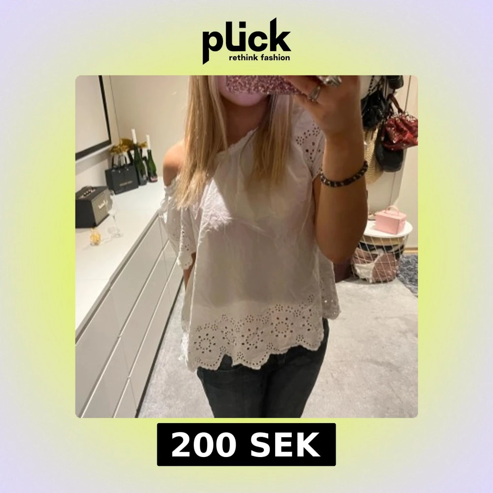 Säljer en söt vit offshoulder blus med broderade detaljer och volangkant. Blusen har en luftig passform och korta ärmar💕