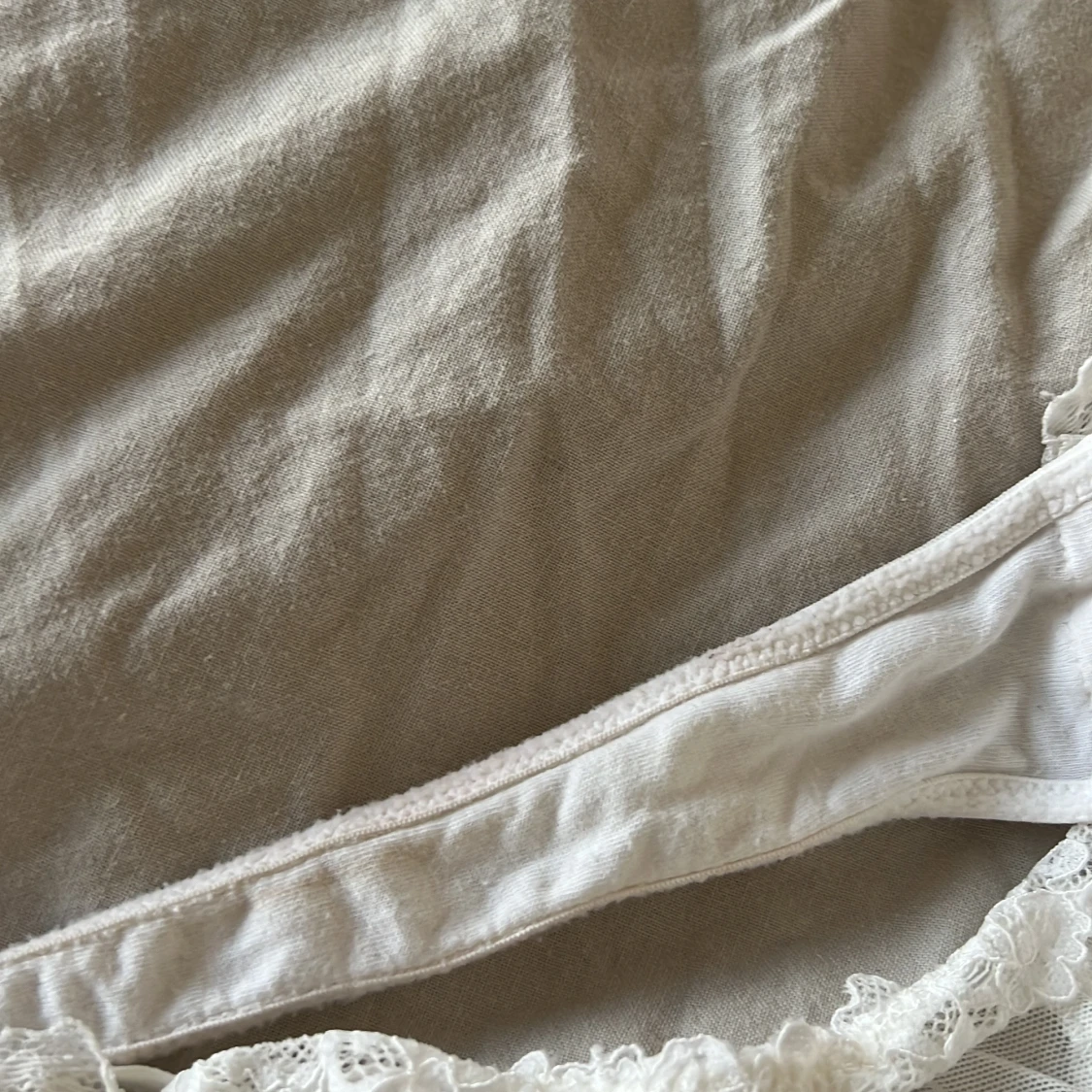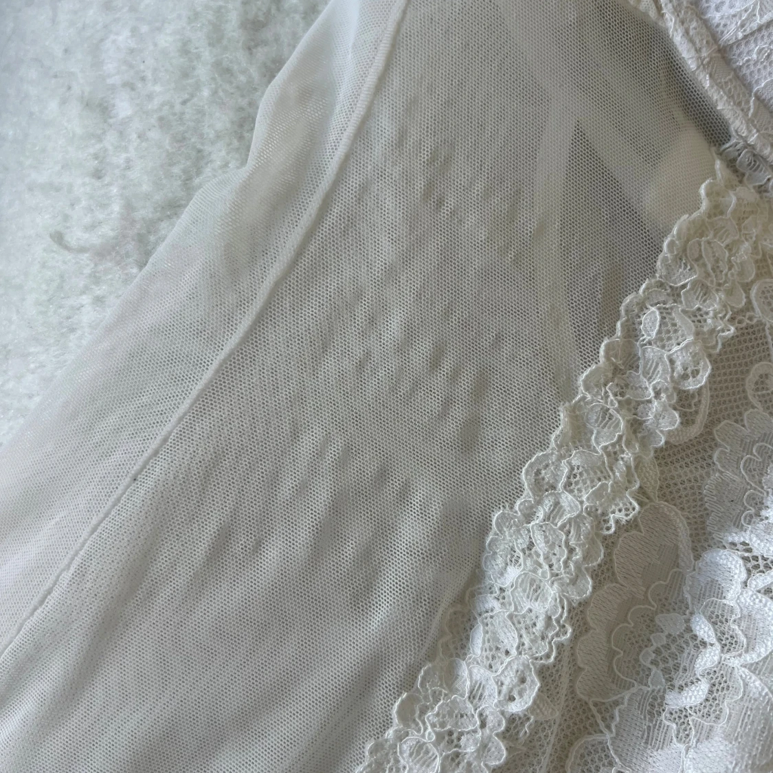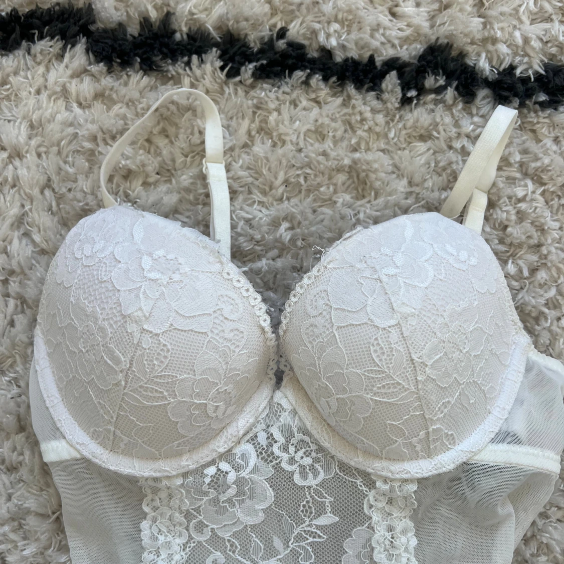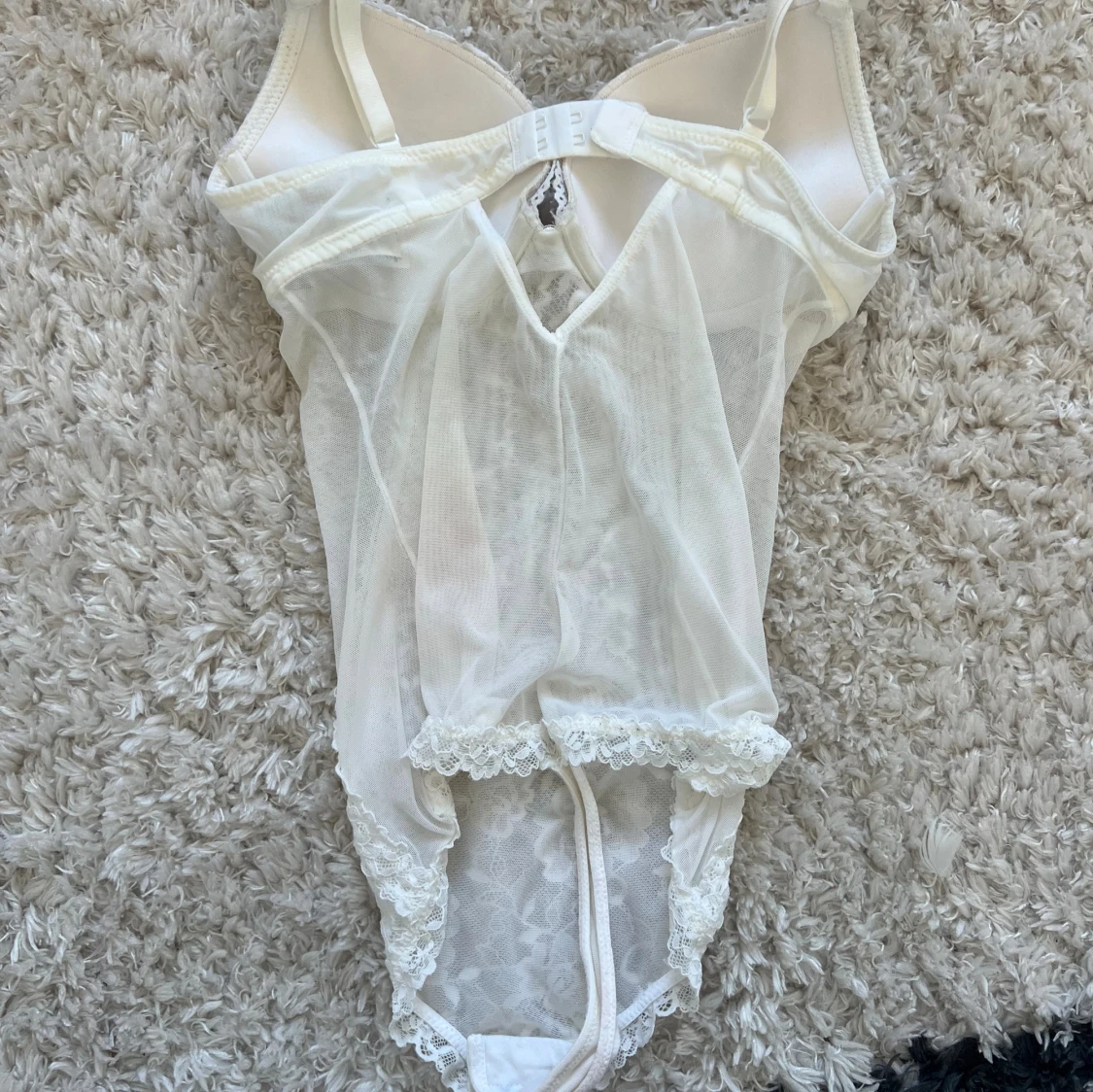Säljer en vit korsett / body med tunna axelband och vadderade kupor. Framsidan har vackert blommönstrad spets och meshdetaljer längs sidorna. Baksidan är i transparent mesh med fina spetskanter. Har några små defekter (se bilder), tyvärr har det kommit brun utan sol på ett ställe vid grenen som jag ej fått bort <3