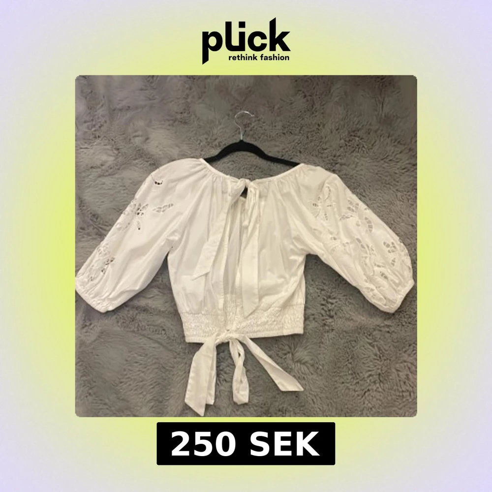Superfin vit blus från Gina Tricot med broderade detaljer och cut-outs på ärmarna. Blusen har trekvartsärmar, knytband bak samt smockad midja för en snygg passform. Aldrig använd. Pris kan diskuteras.