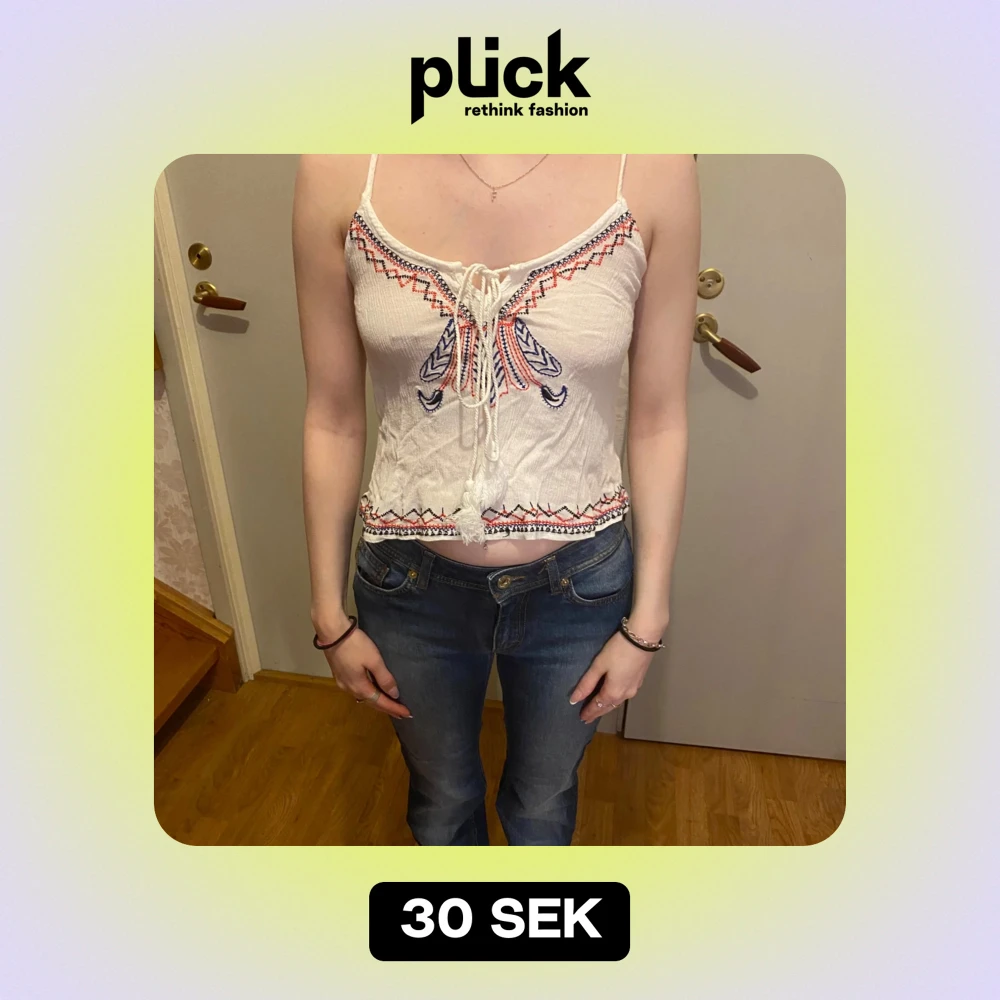 En fin vit linnetopp med broderade detaljer i rött och blått. Toppen har smala axelband och en söt knytning framtill med tofsar🤍