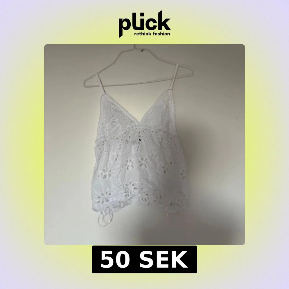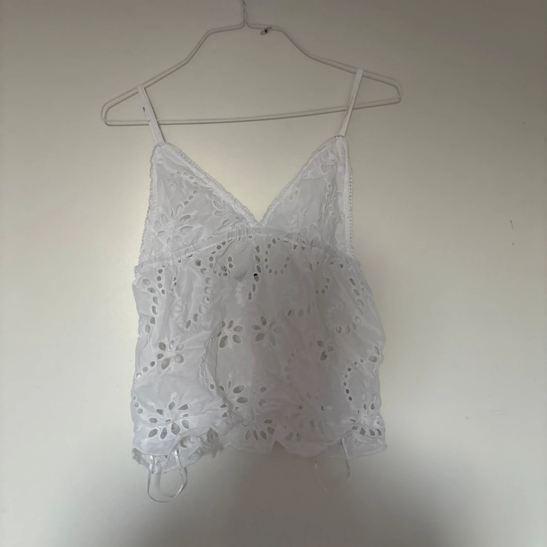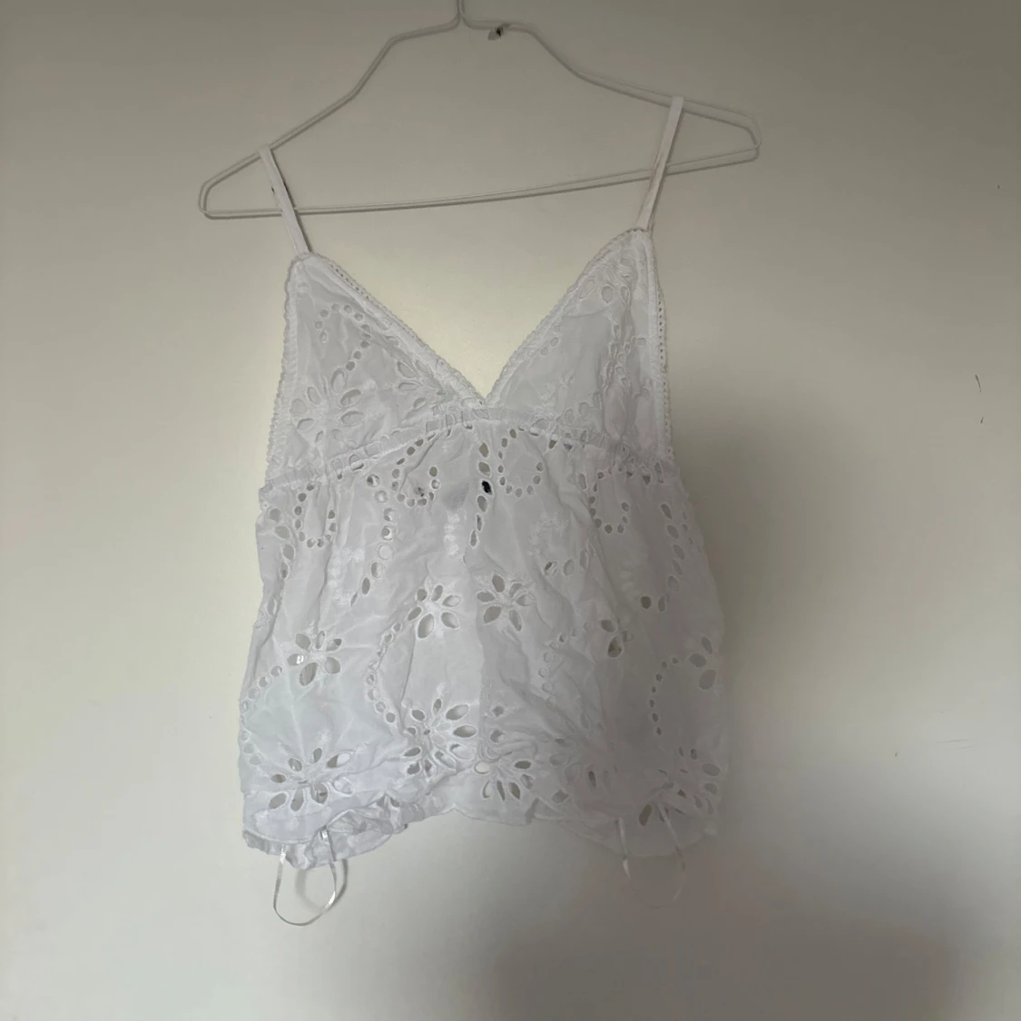 Söt vit linnetopp med tunna axelband och v-ringning. Toppen har broderade blommor och spetsdetaljer, samt en luftig och lätt känsla. Perfekt för varma dagar och ger en romantisk vibe till din outfit.