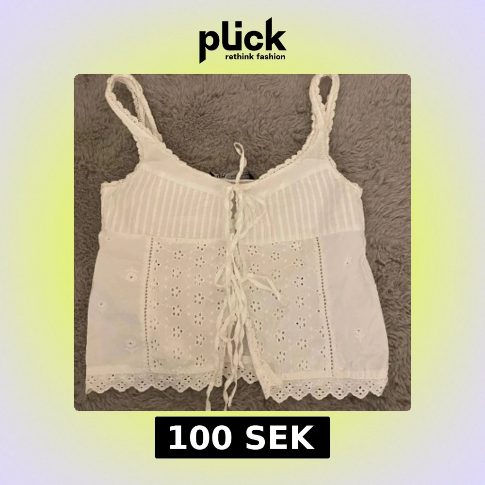 Säljer en jätte söt vit topp med broderade blommor, spetsdetaljer och knytning där fram. Helt perfekt topp nu till sommaren.
