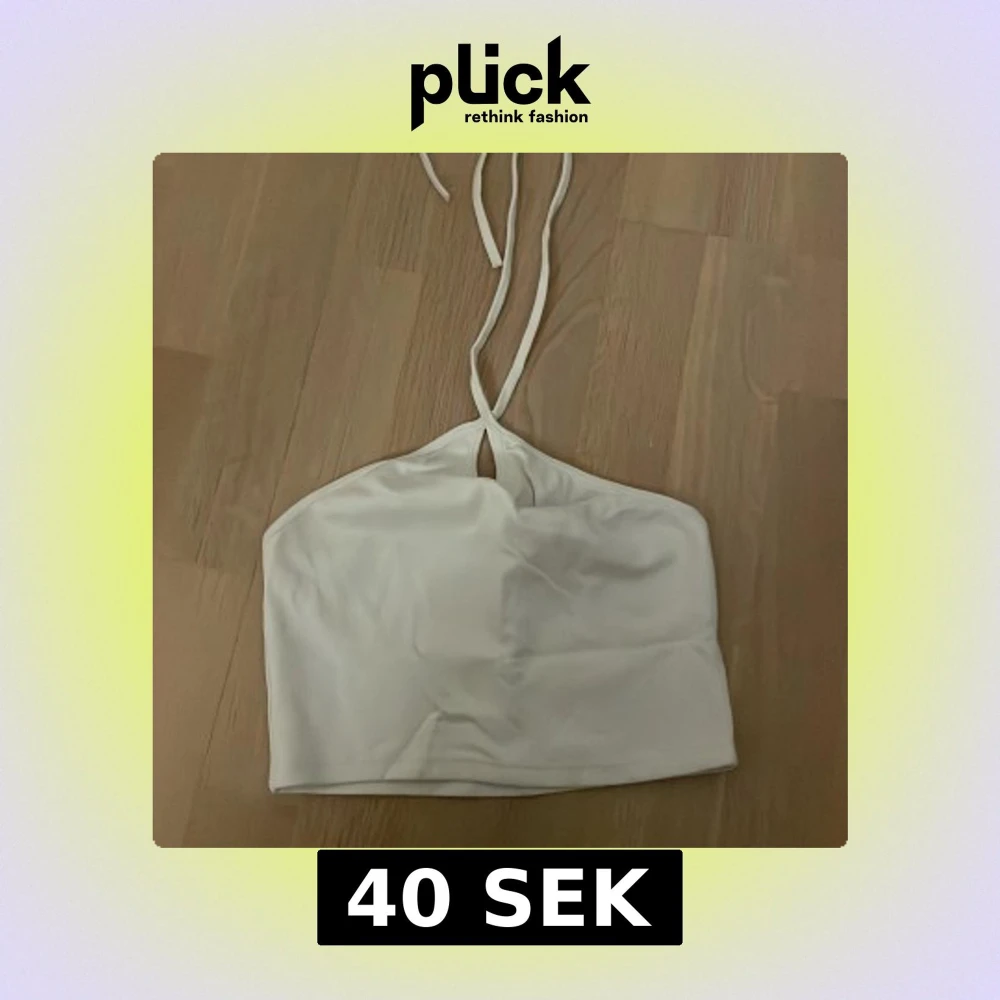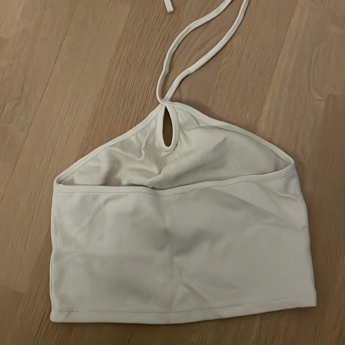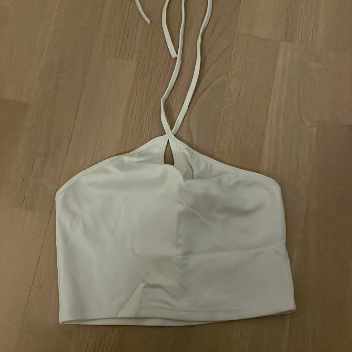 Croppad vit topp, Stretchig. Halterneck och knyts i nacken. Storlek M men liten i storleken! Motsvarar en S