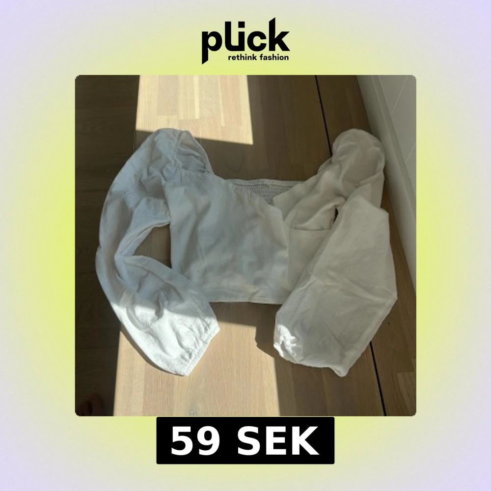 Säljer en vit croppad blus med långa puffärmar och resår vid ärmslut och midja. Toppen har en fyrkantig ringning och är perfekt för dig som gillar romantisk och trendig stil. Passar snyggt till både jeans och kjol.