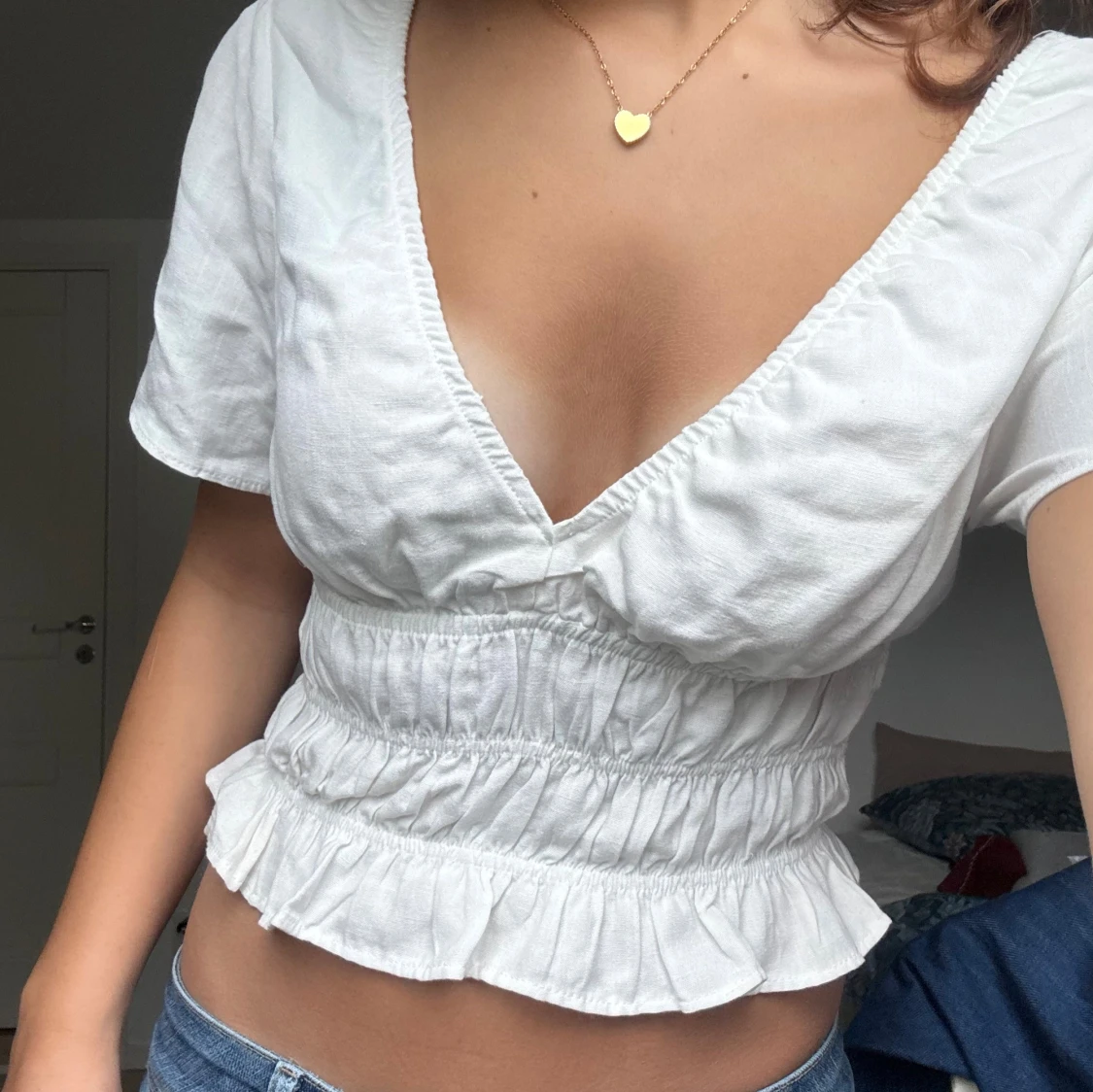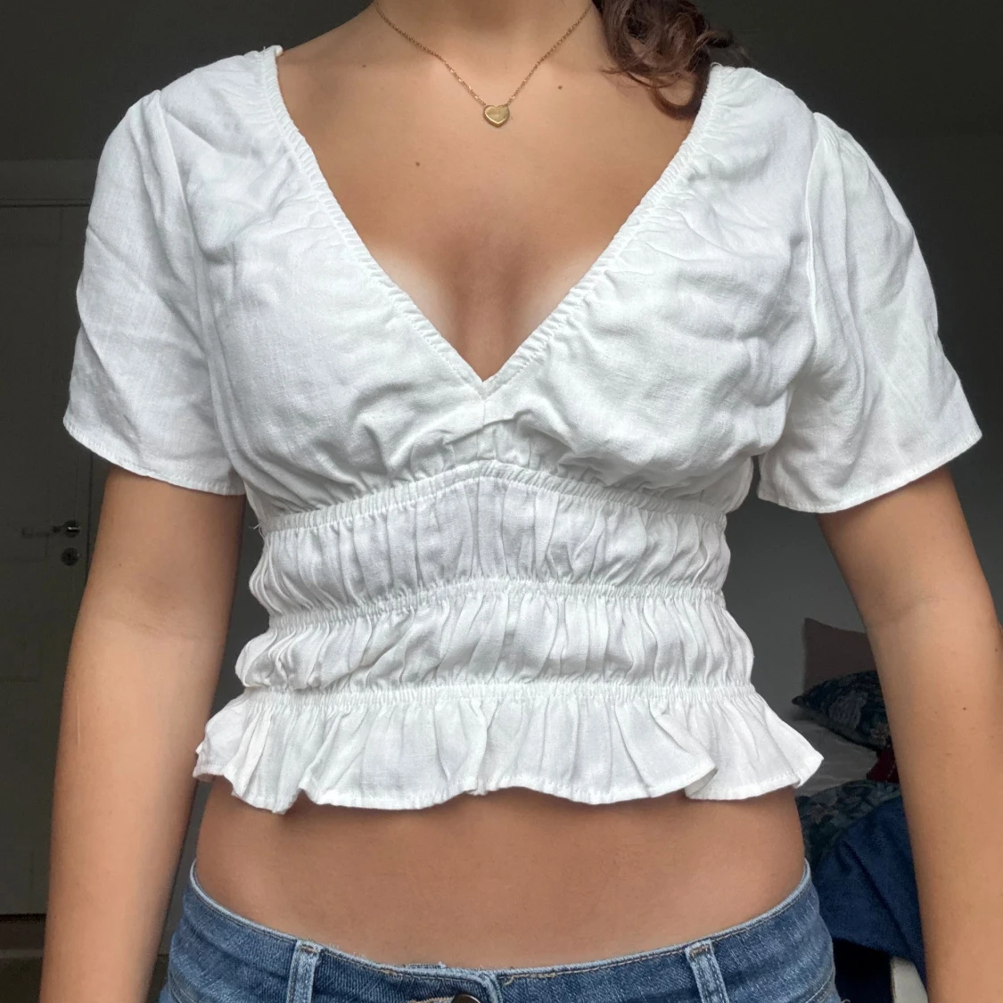 Säljer en vit croppad blus med djup v-ringning och korta ärmar. Toppen har smockad midja och volangkant nedtill som ger en söt och trendig look.