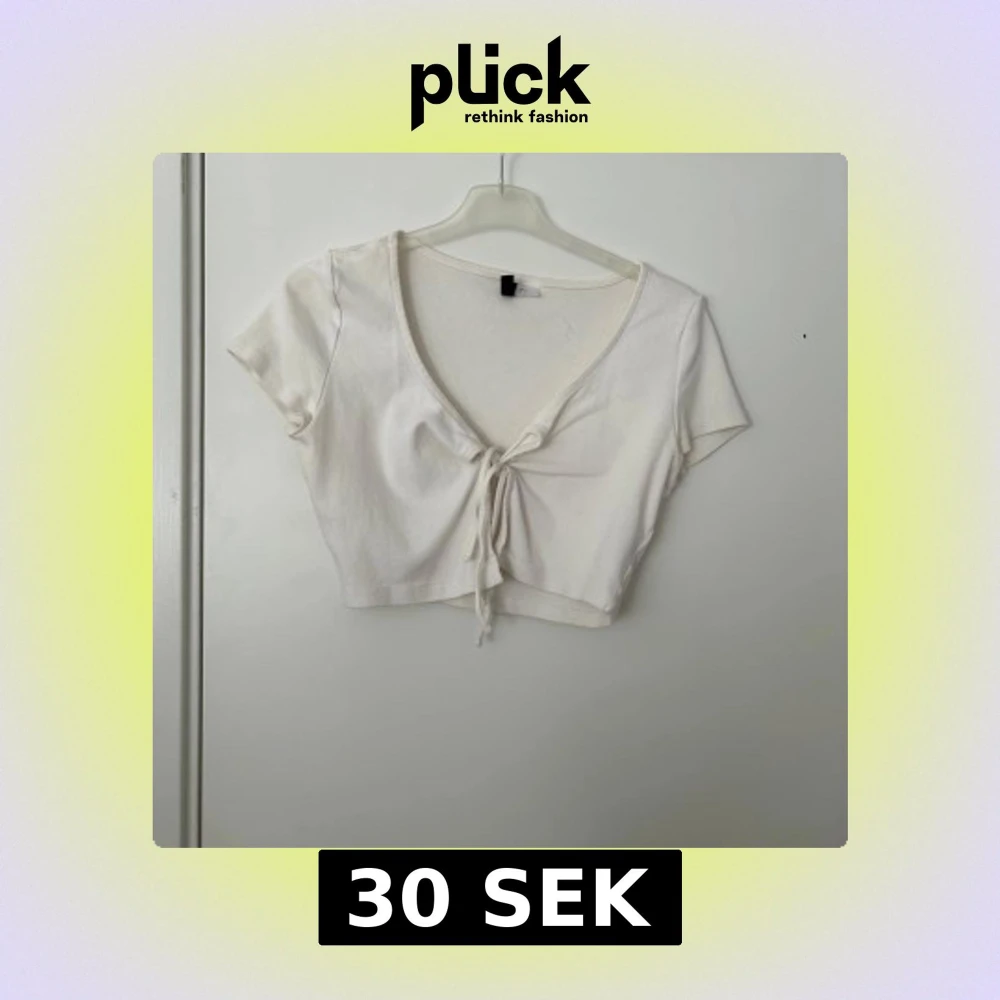 Säljer en vit croppad topp med korta ärmar och v-ringning. Toppen har en snygg knytning framtill som ger en trendig look. Perfekt att matcha med höga jeans eller kjol.
