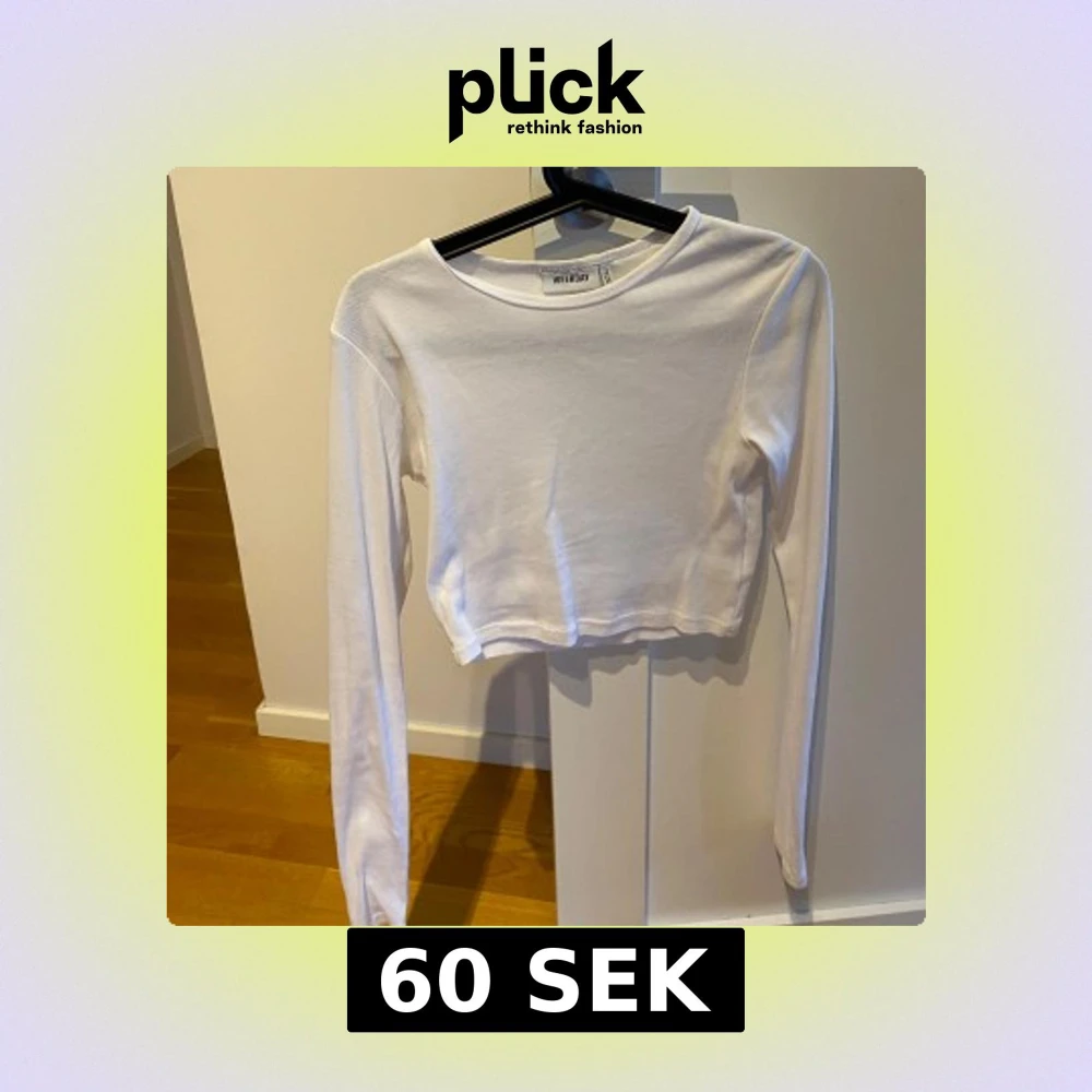 Säljer en stilren vit croppad topp från Weekday. Den har långa ärmar och är i ribbat matrial, som är perfekt till vardags men också finare tillfällen. Toppen är använd fåtal gånger, så den är i ett bra skick! I storlek M