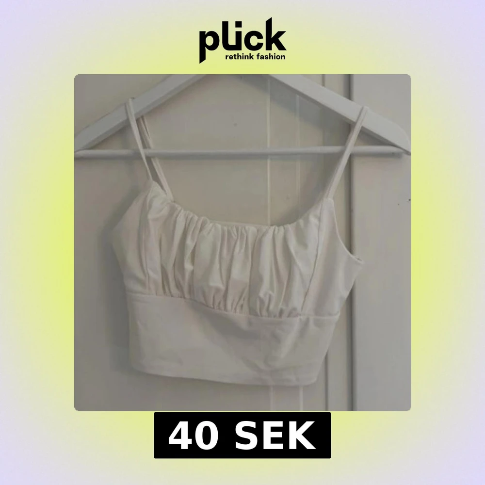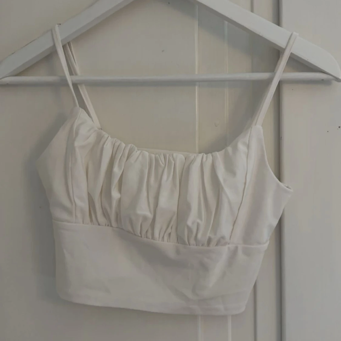 Säljer en vit croppad linnetopp med smala axelband och snygga rynkdetaljer över bysten. Toppen har en enkel och stilren design som passar perfekt till sommaren. Materialet känns mjukt och lätt mot huden. Aldrig använd