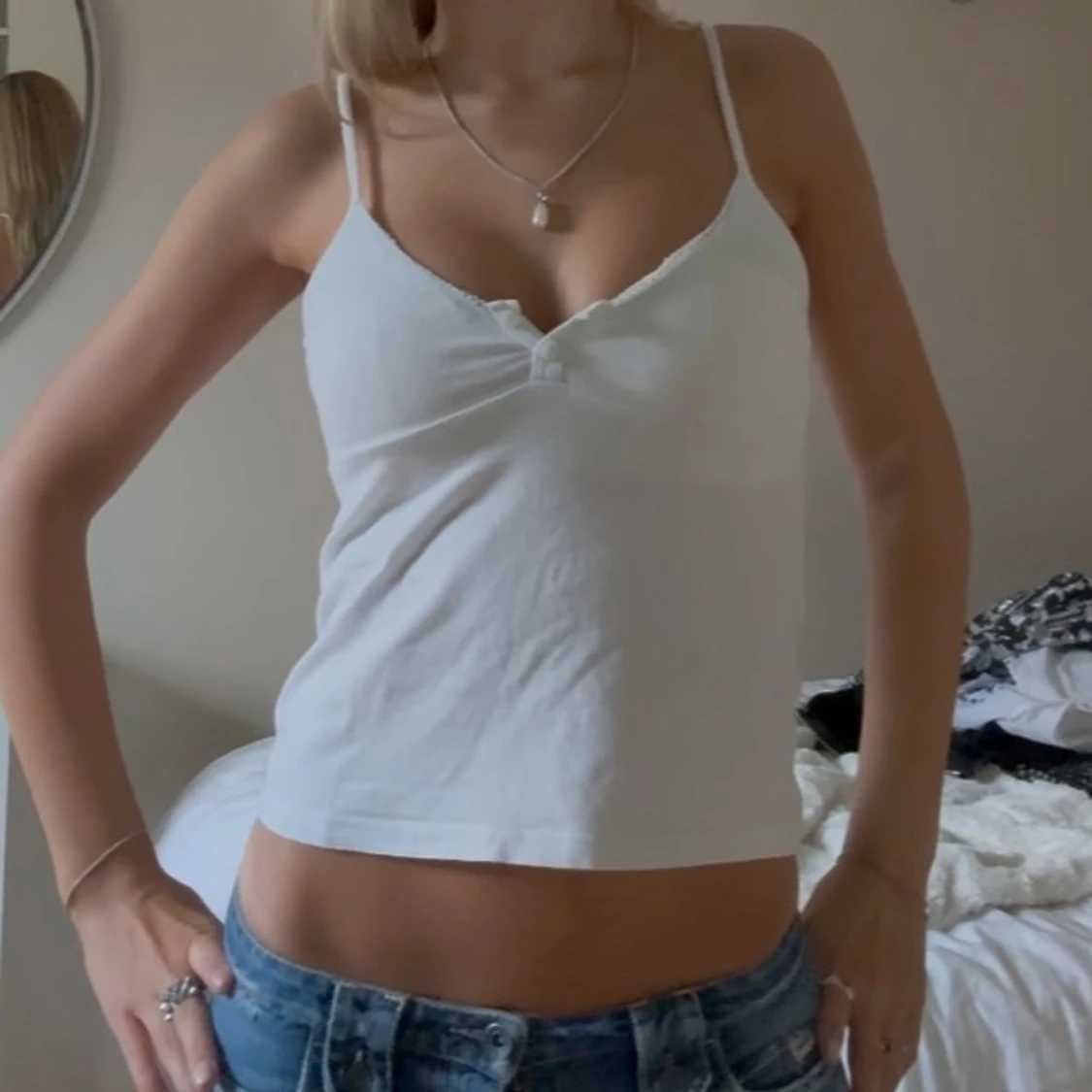 Säljer en vit croppad linnetopp med smala axelband och en liten spetskant vid urringningen. Toppen har en v-ringad form och är tillverkad i mjuk bomull, perfekt för varma dagar. Enkel och clean look som är lätt att matcha med jeans eller kjol.