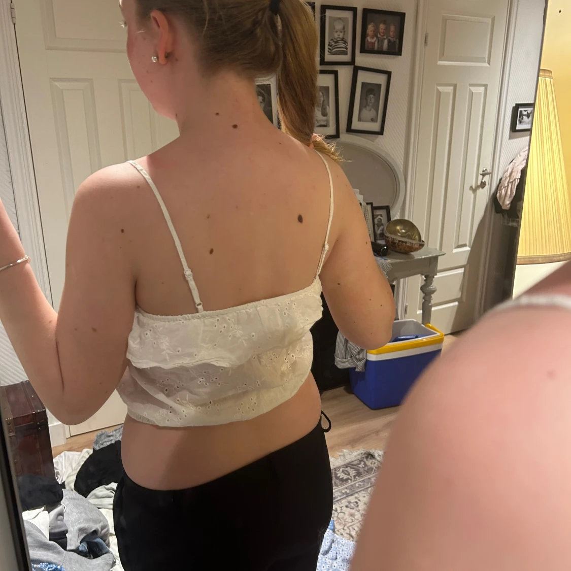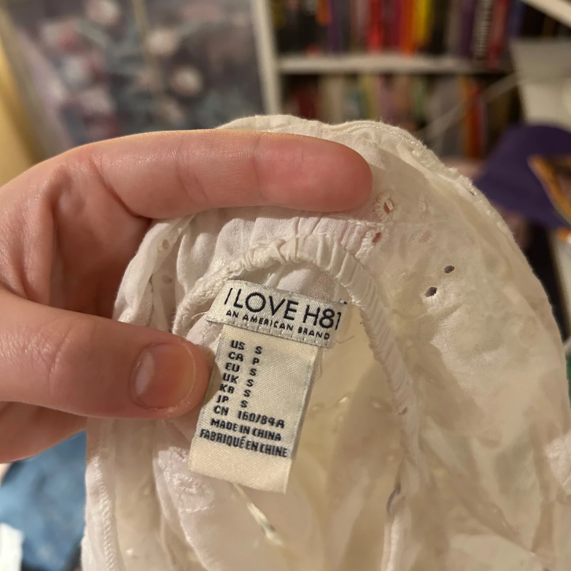 Säljer en söt vit croppad linnetopp från I Love H81. Toppen har tunna axelband, broderade hålmönster och en volangdetalj framtill. Perfekt för varma dagar och enkel att matcha med jeans eller kjol.