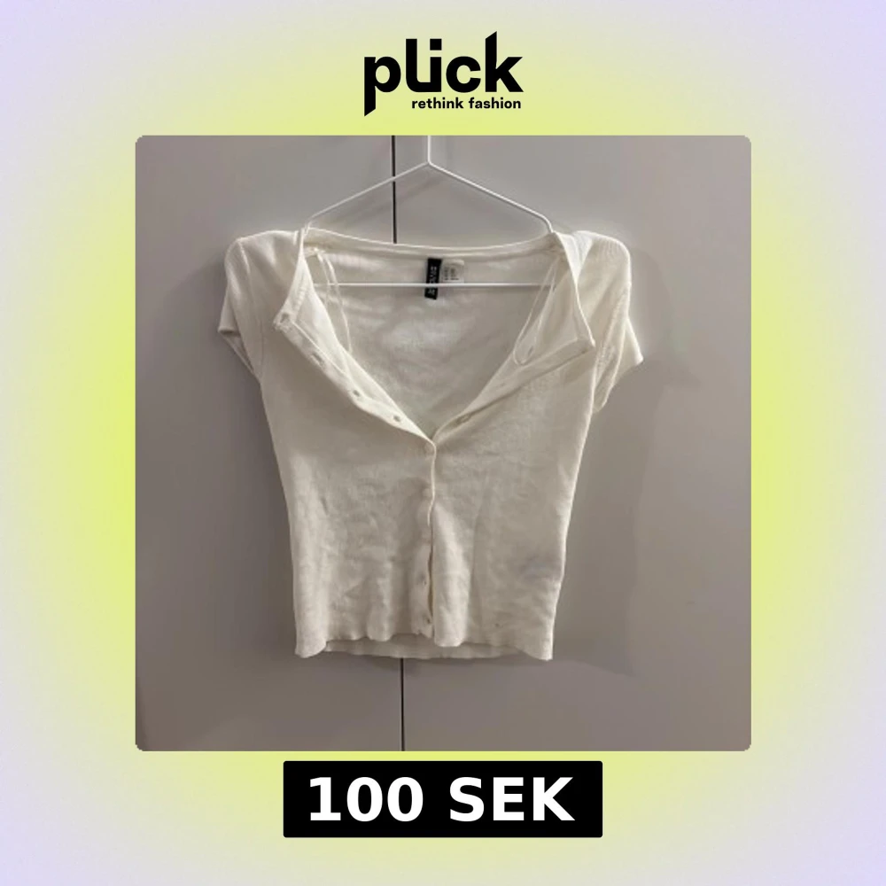 Säljer en vit croppad topp från H&M med korta ärmar och knappar framtill. Toppen har en mjuk ribbad struktur och en v-ringad hals som ger en chill och snygg look. Perfekt för dig som gillar enkla och stilrena plagg.