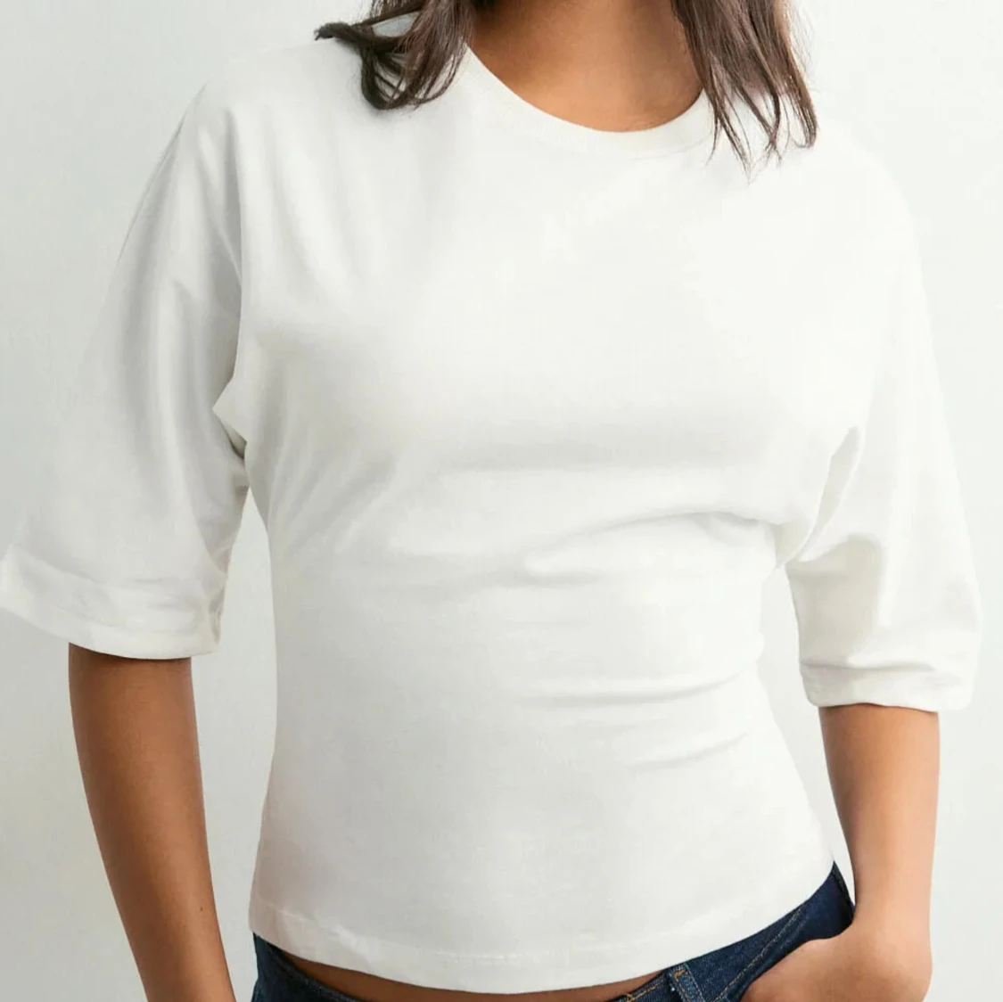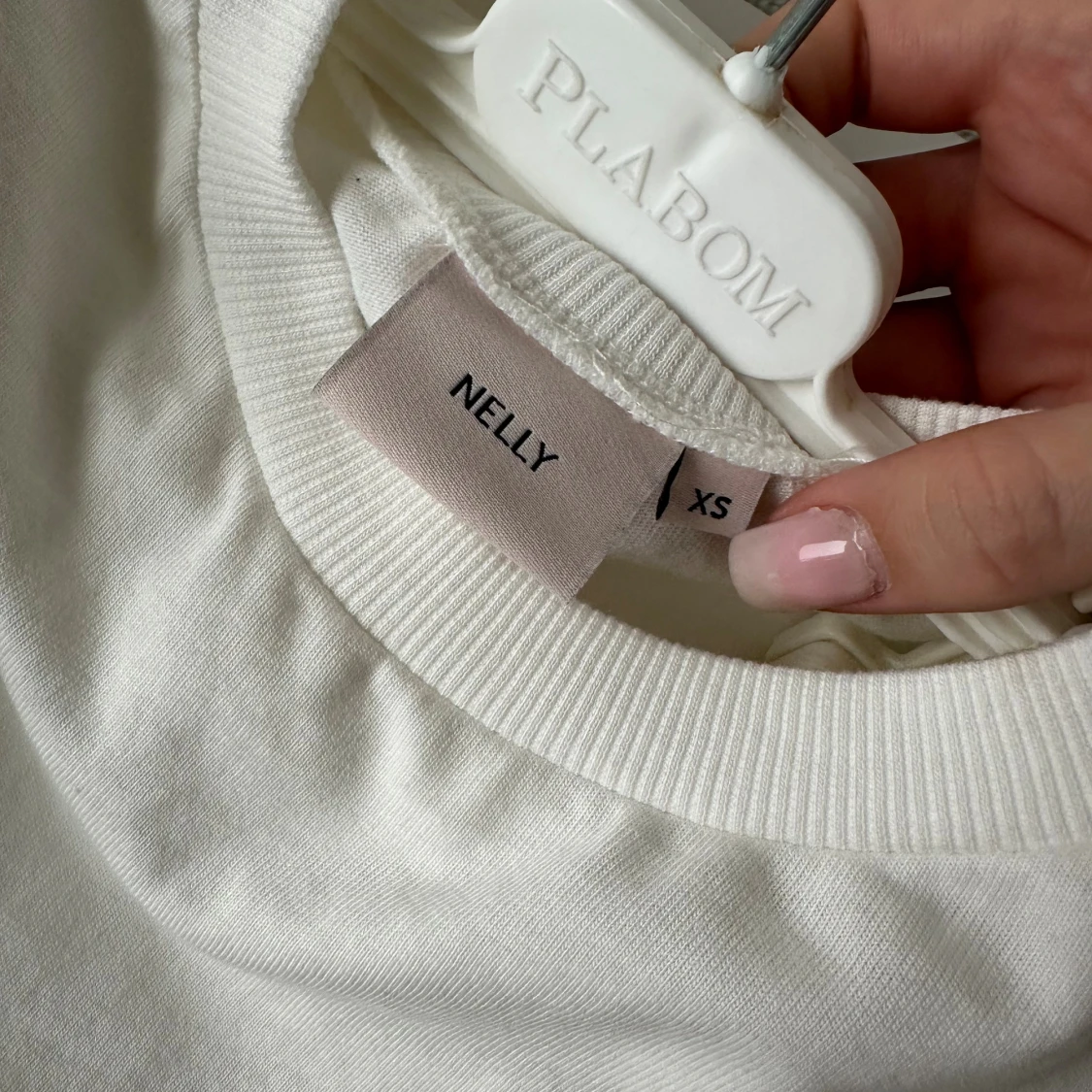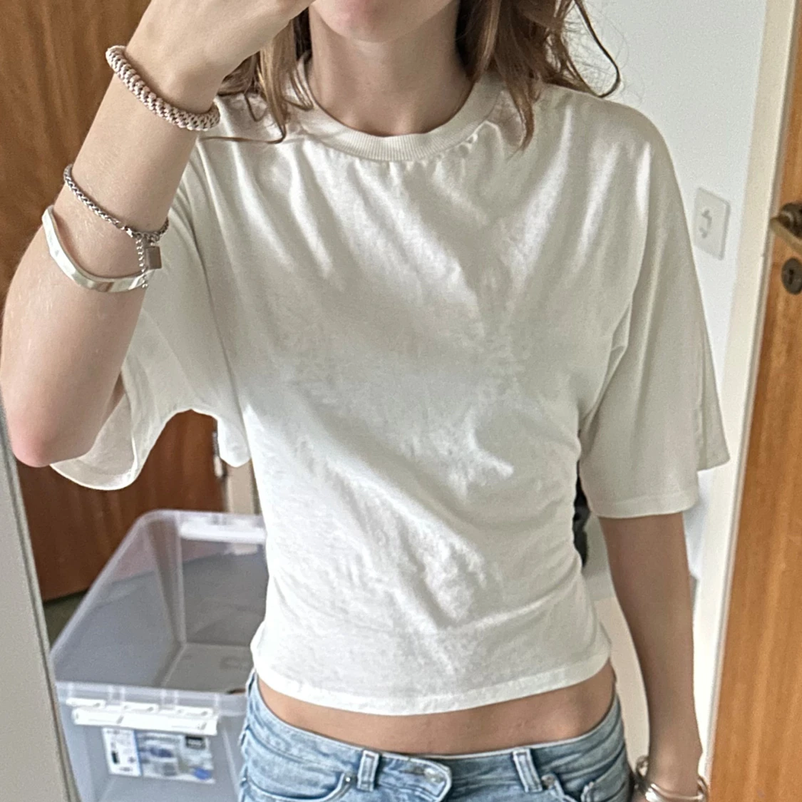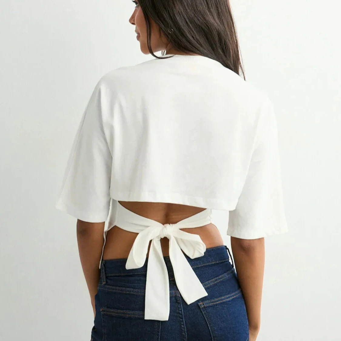 Säljer en vit croppad topp med korta ärmar och rund hals. Toppen har en öppen rygg med breda band som knyts i en rosett bak, vilket ger en snygg och trendig look.