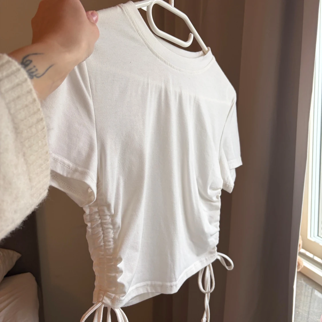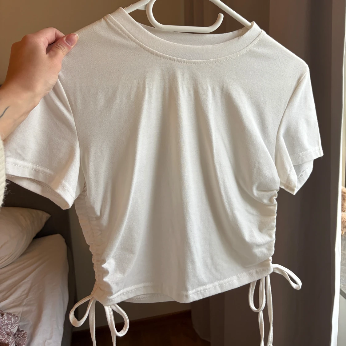Säljer en vit croppad topp med korta ärmar och snygg snörning i båda sidorna. Toppen har rund halsringning och är tillverkad i mjuk bomull, perfekt för en fräsch och enkel look. Passformen är normal och toppen är enkel att styla till olika outfits.