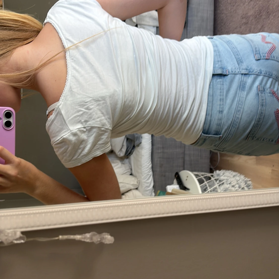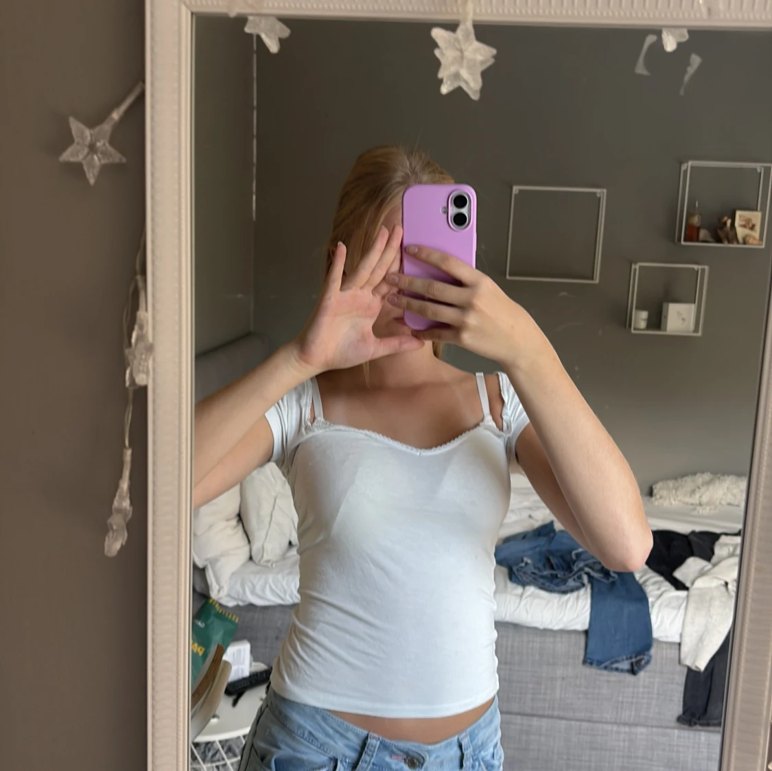 Säljer en vit croppad topp med korta ärmar och söt spetskant längs den v-ringade urringningen. Toppen är figurnära och har en enkel, stilren look som passar perfekt till jeans eller kjol. Materialet känns mjukt och stretchigt.