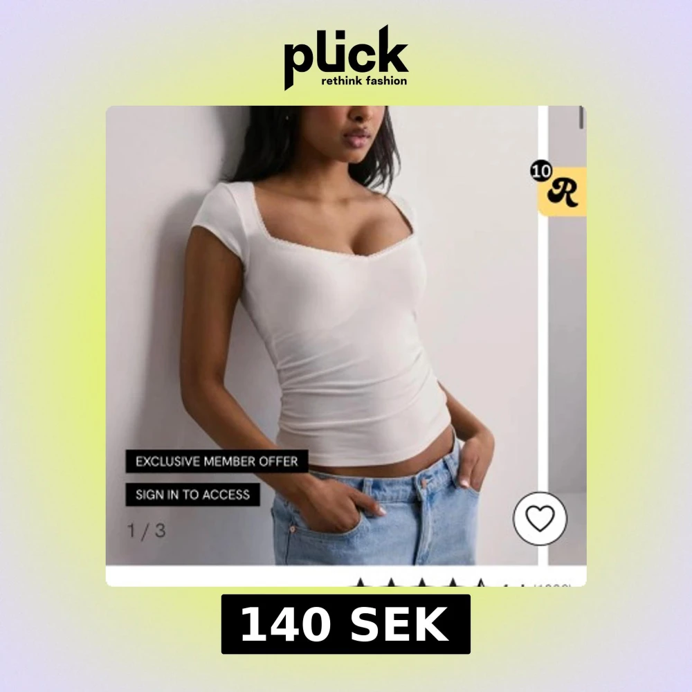 Säljer en vit croppad topp med djup v-ringning och korta ärmar. Toppens material är mjukt och stretchigt, troligen bomull eller syntet. Passformen är tight och den har en enkel, stilren design som är lätt att matcha med olika outfits.