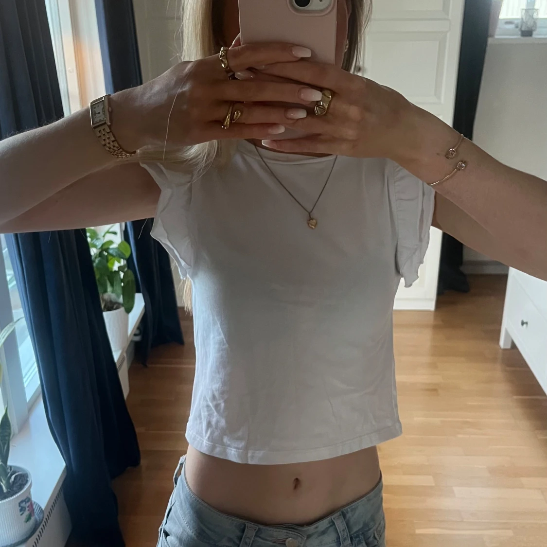 Säljer en vit croppad topp med volangdetaljer på axlarna.