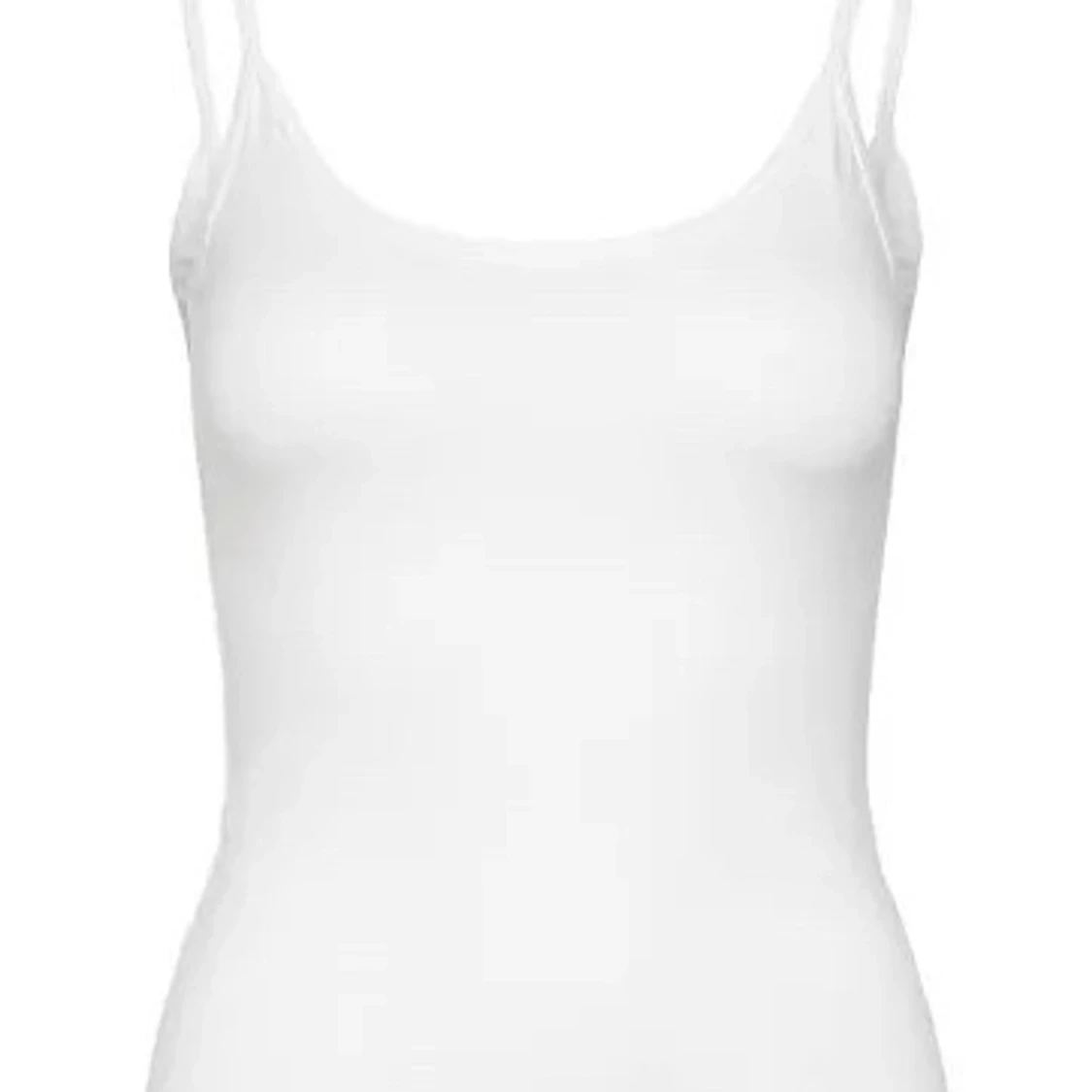 Säljer en klassisk vit linnetopp med smala axelband och rundad halsringning. Toppen är figurnära och passar perfekt till jeans eller kjol. Materialet känns mjukt och stretchigt, vilket gör den superbekväm att bära hela dagen.