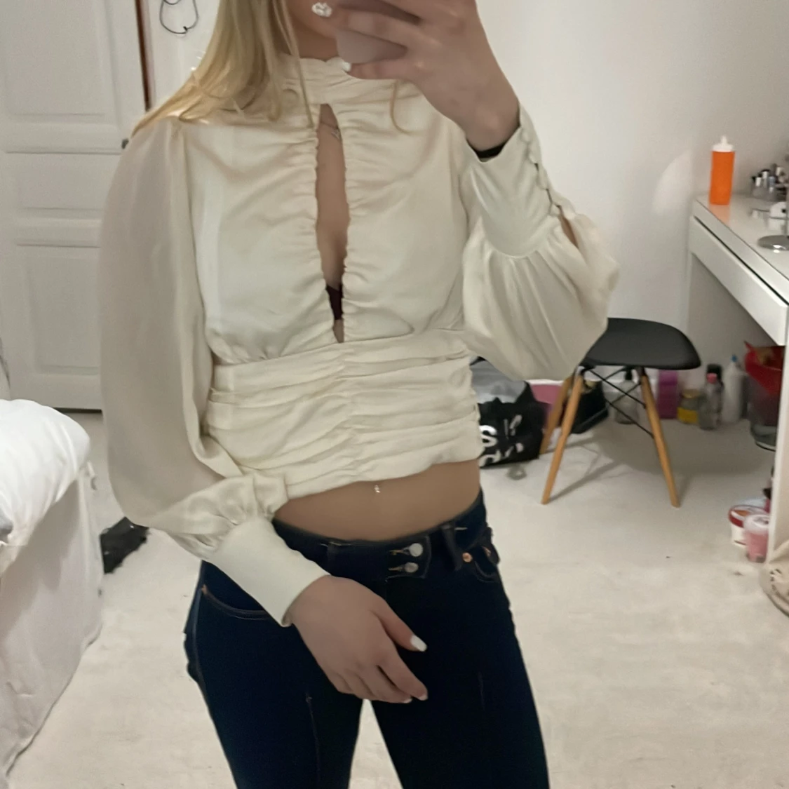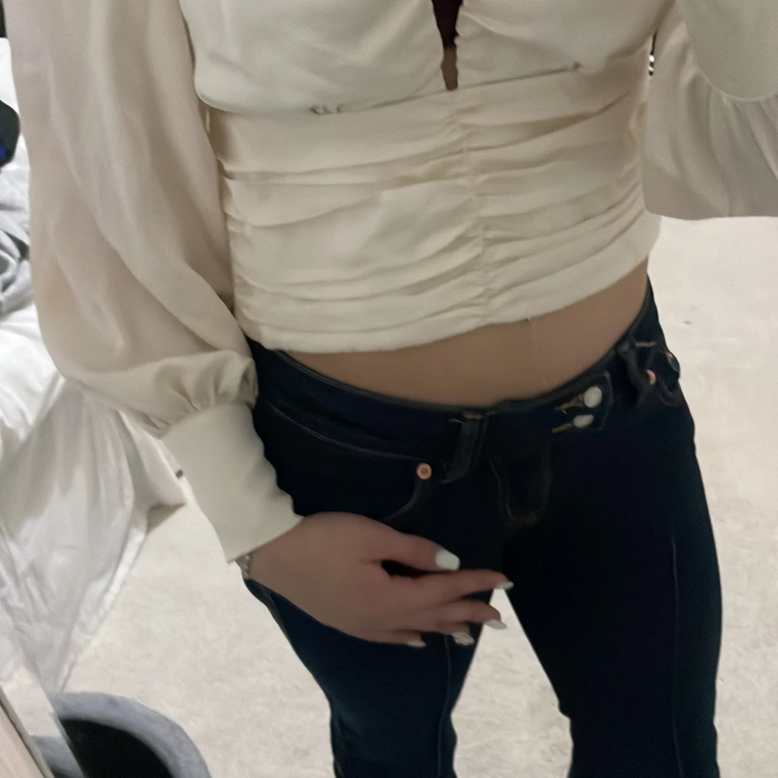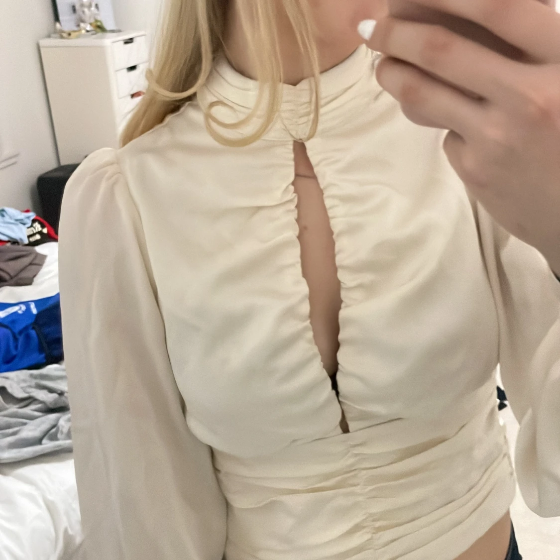 Säljer en elegant vit blus med långa ärmar och rynkdetaljer framtill. Blusen har en hög hals och en liten öppning vid bröstet som ger en stilren look. Perfekt för att klä upp en outfit!