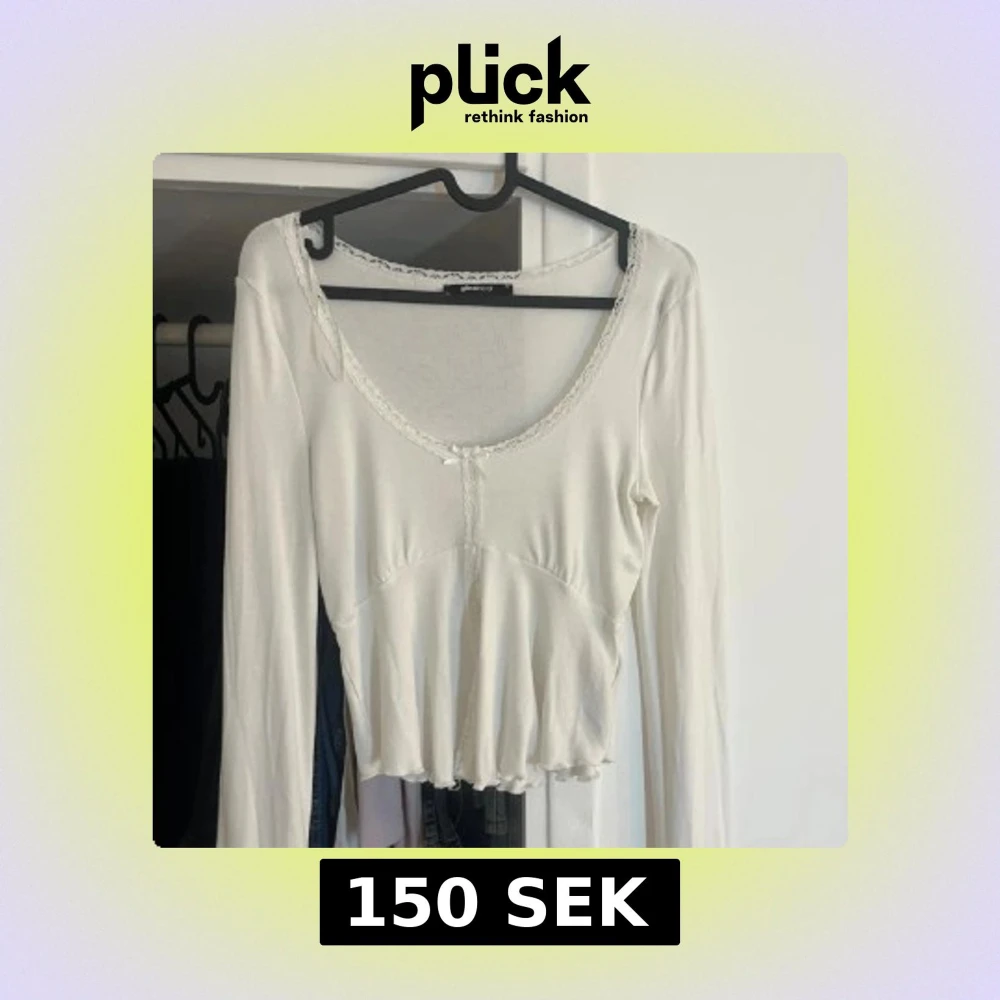 Supersöt vit topp från Gina Tricot med långa ärmar, spetsdetaljer längs urringningen och en liten rosett framtill. Toppen har en lätt volang nertill. Använd 1 gång.