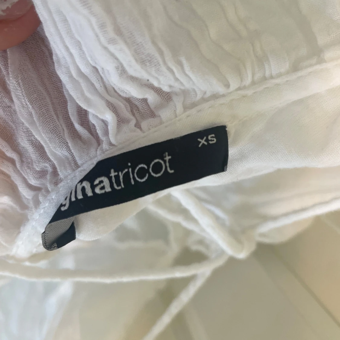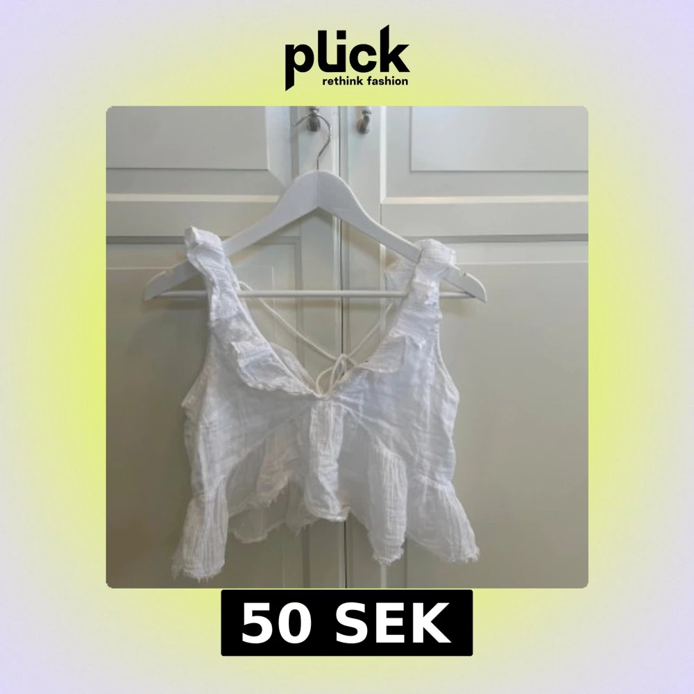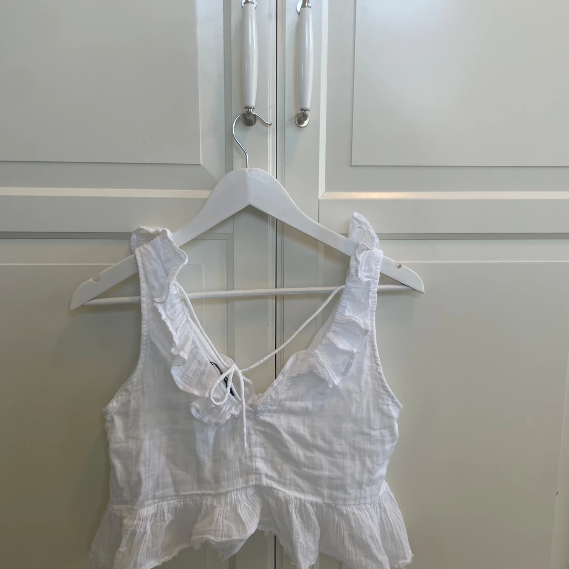 Supersöt vit linnetopp från Gina Tricot i storlek XS. Toppen har volangdetaljer längs axelbanden och nederkanten, samt knytning i ryggen. Luftigt och lätt material som passar perfekt till varma dagar. Aldrig använd