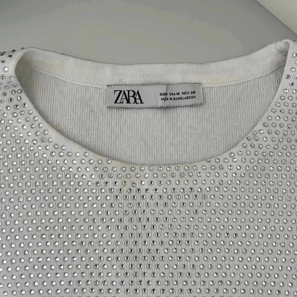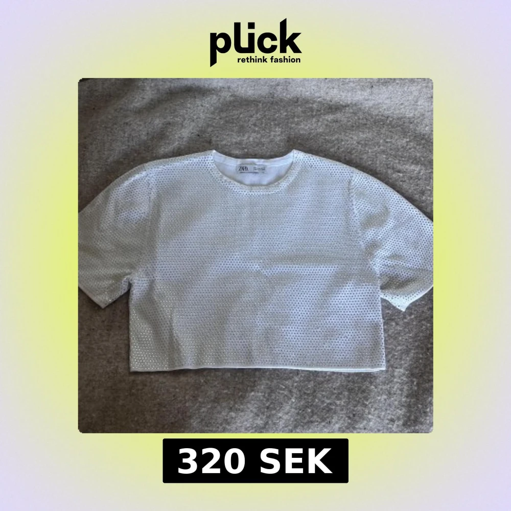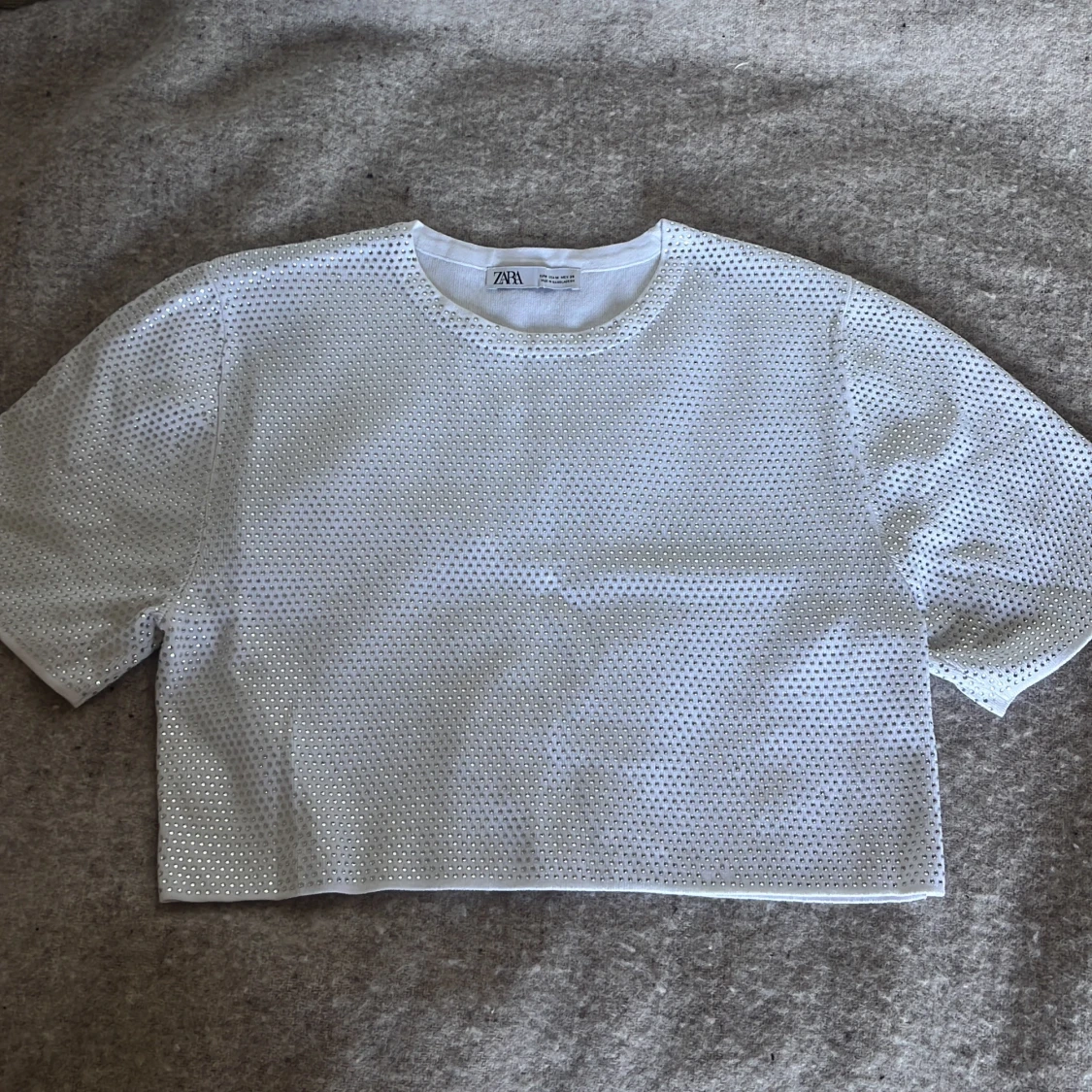 Superfin vit topp från Zara med croppad passform. Paljetterna sitter fast hårt, ingen risk för att de åker av! Använd en gång, passar bra med linne under! Toppen skulle passa vem som helst egentligen oberoende storlek. Nypris 400