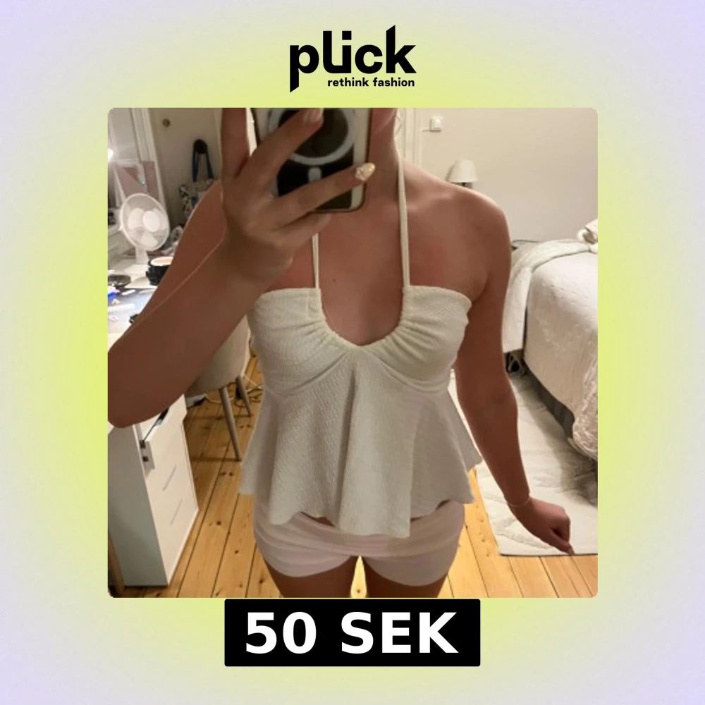 Supersöt vit linnetopp med halterneck och lätt rynkad byst. Toppen har en flowy, utsvängd passform och är tillverkad i ett vågigt, strukturerat tyg. Perfekt för varma dagar när du vill ha en luftig och fräsch look.