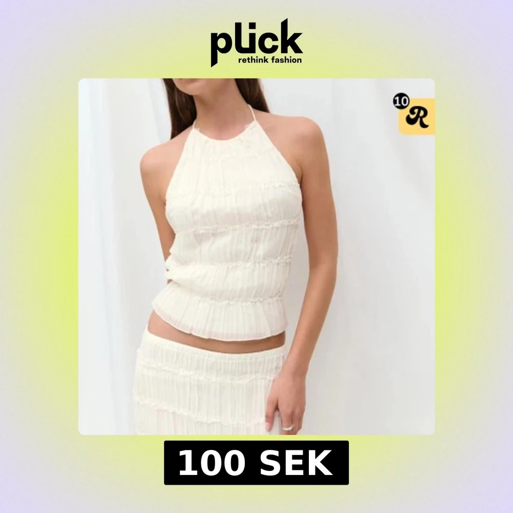 Supersöt vit halterneck topp med tunna knytband i nacken och ryggen. Toppen är ärmlös och har en lätt plisserad struktur med volangdetaljer. Perfekt för varma dagar och ger en fräsch och trendig look.