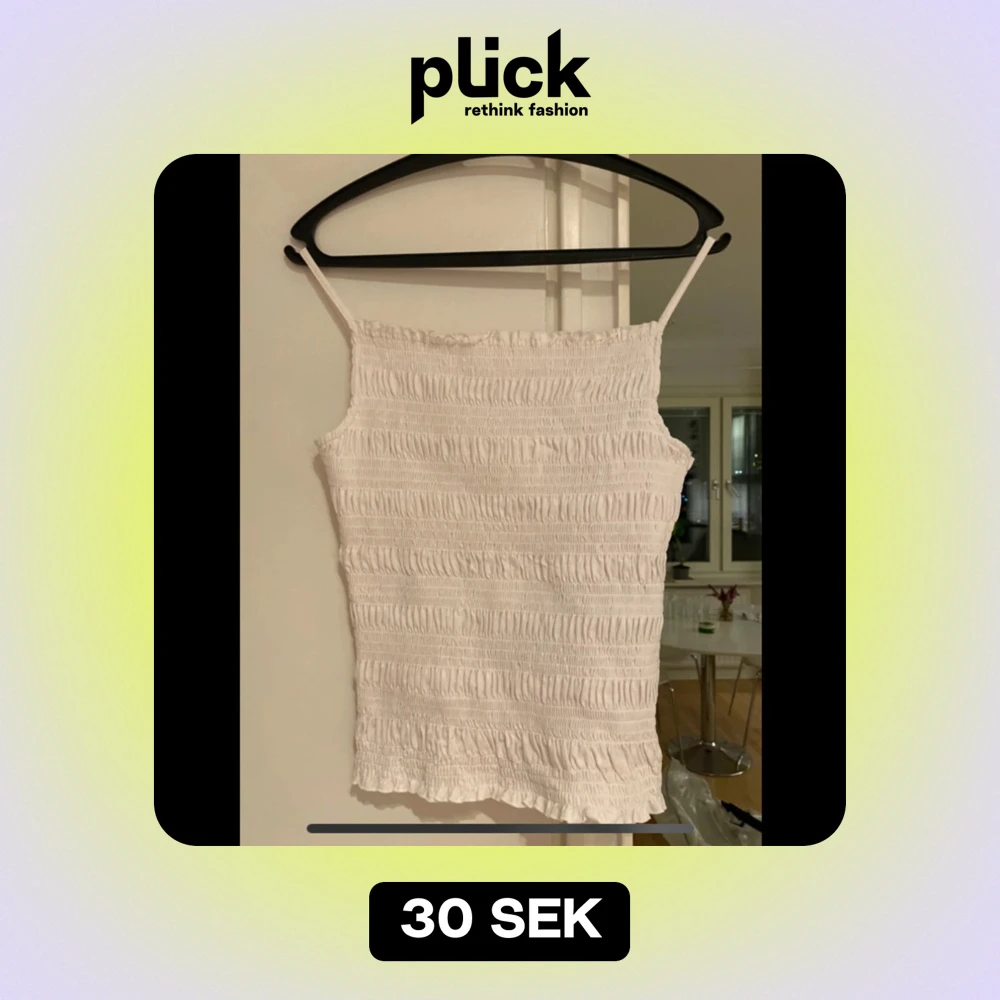 Säljer en söt vit ribbad topp med smala axelband. Toppen har en elastisk och bekväm passform. Toppen är i en strl L men är liten i strl så passar bättre på en M