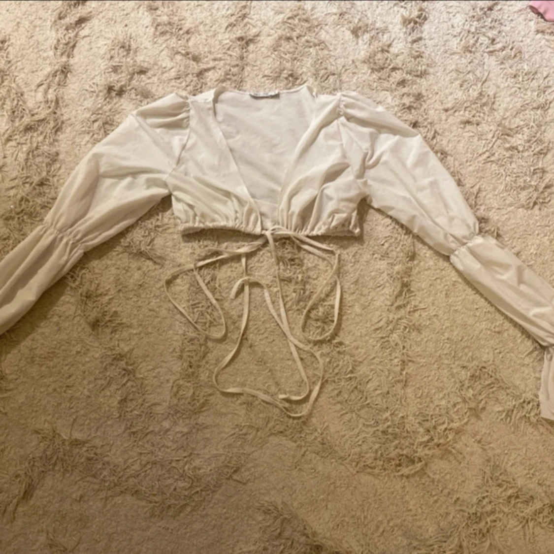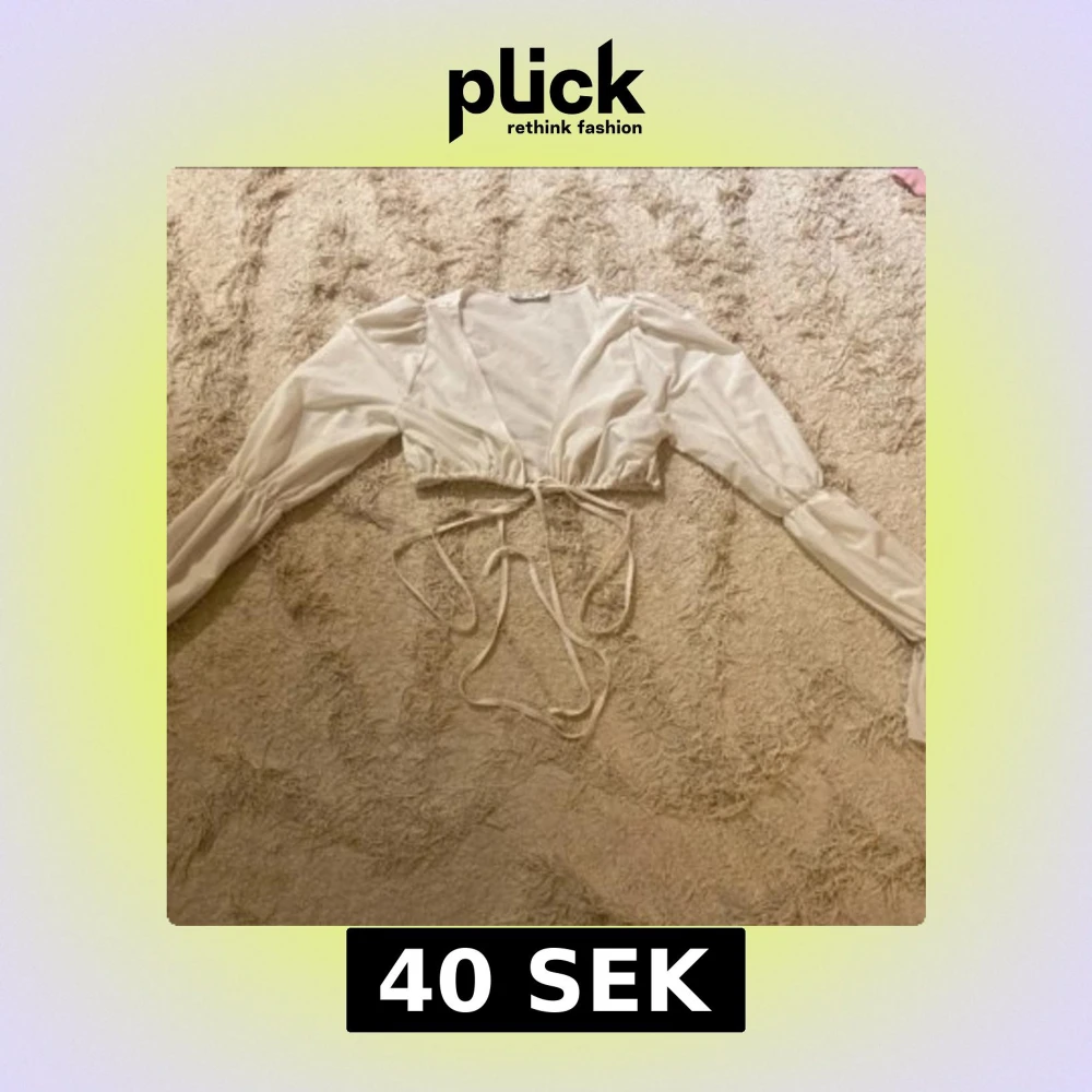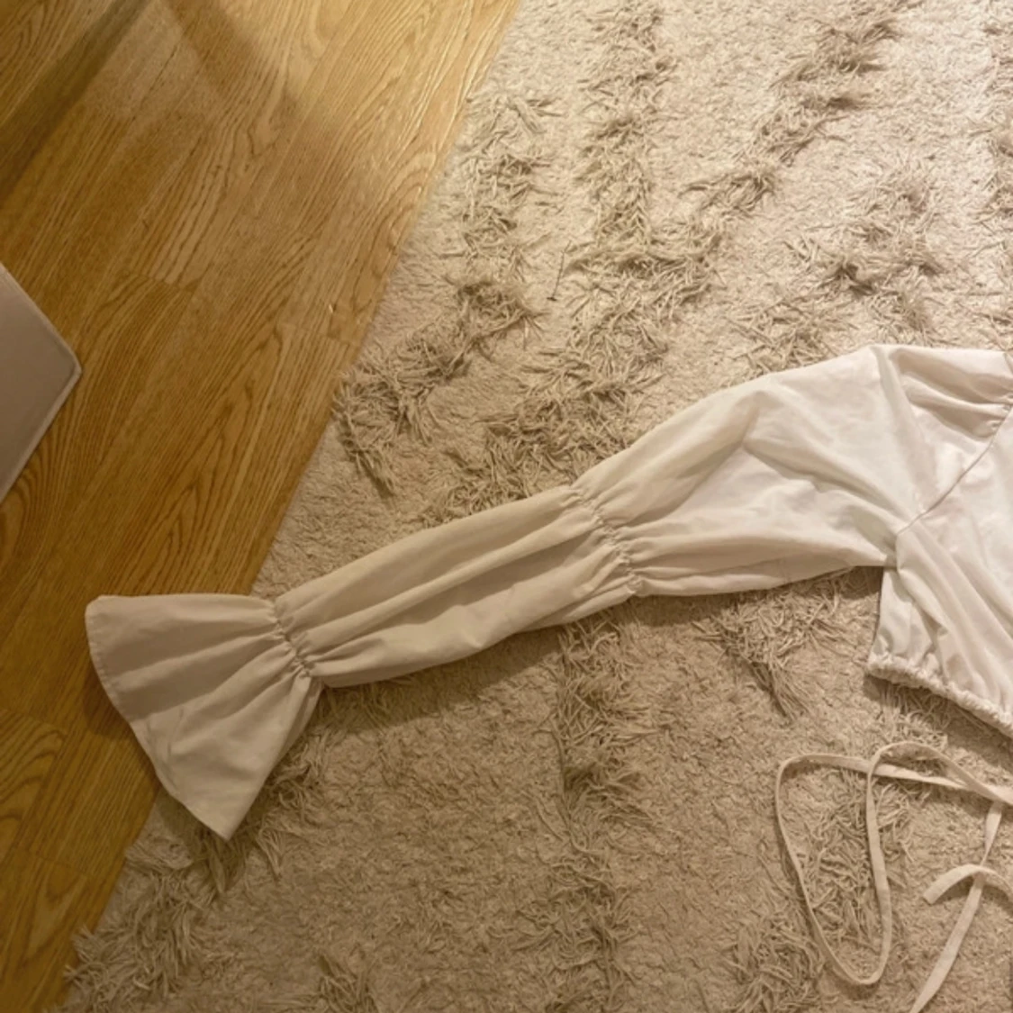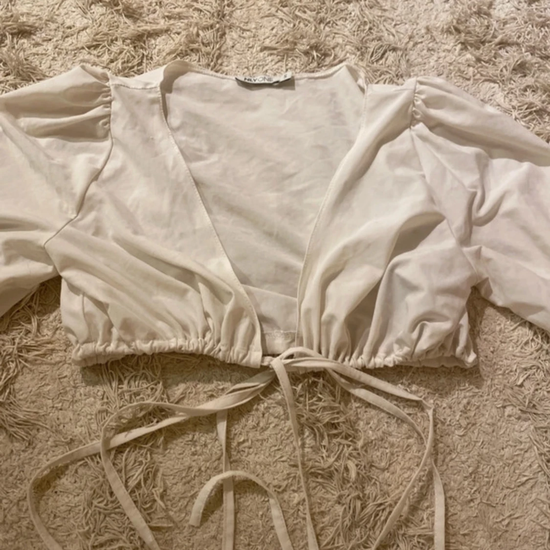 Säljer en stilren vit blus från NLY One med långa ärmar och knytning framtill. Perfekt för en chic look med sin omlott-design och lätta material.
